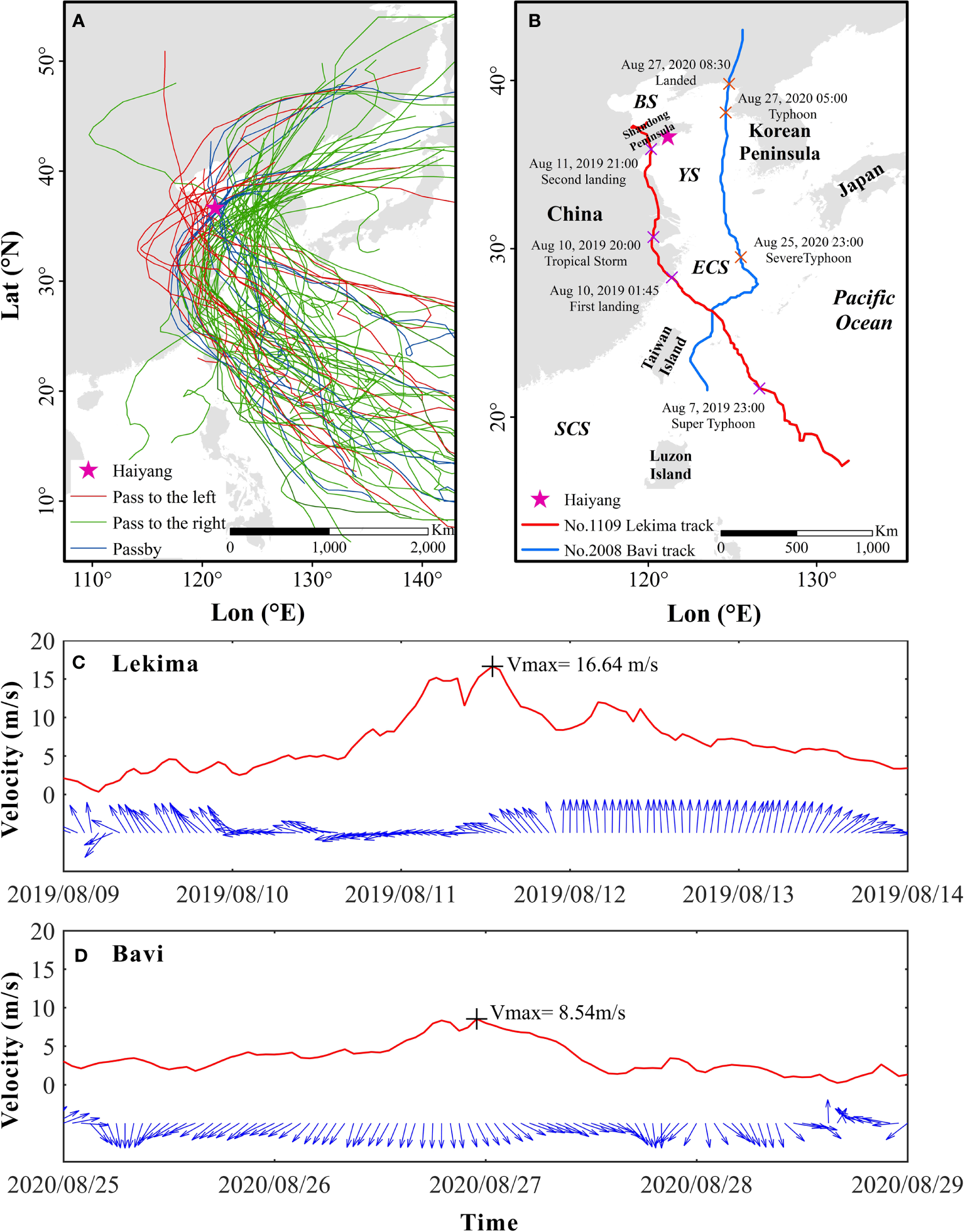 Tracks of the historic TCs that affected the Shandong Peninsula from 1949 to 2020 (A). Tracks of the Lekima and Bavi considered in this study (B). Hourly time series of wind velocity (red line) and direction (blue arrows) at Haiyang beach (the wind site in Figure 1C) during Lekima (C) and Bavi (D), respectively.