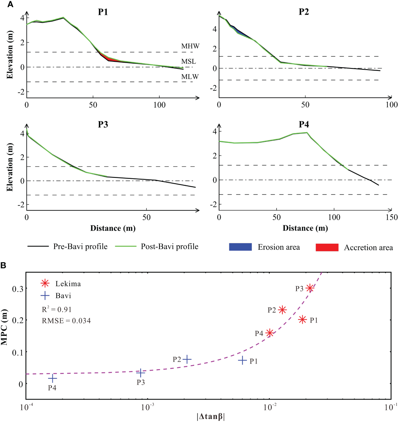 Changes in beach profiles before and after Bavi (A). Relationship between beach slope and mean profile change (MPC) induced by two TCs (B), the dashed purple line is the fitted curve.