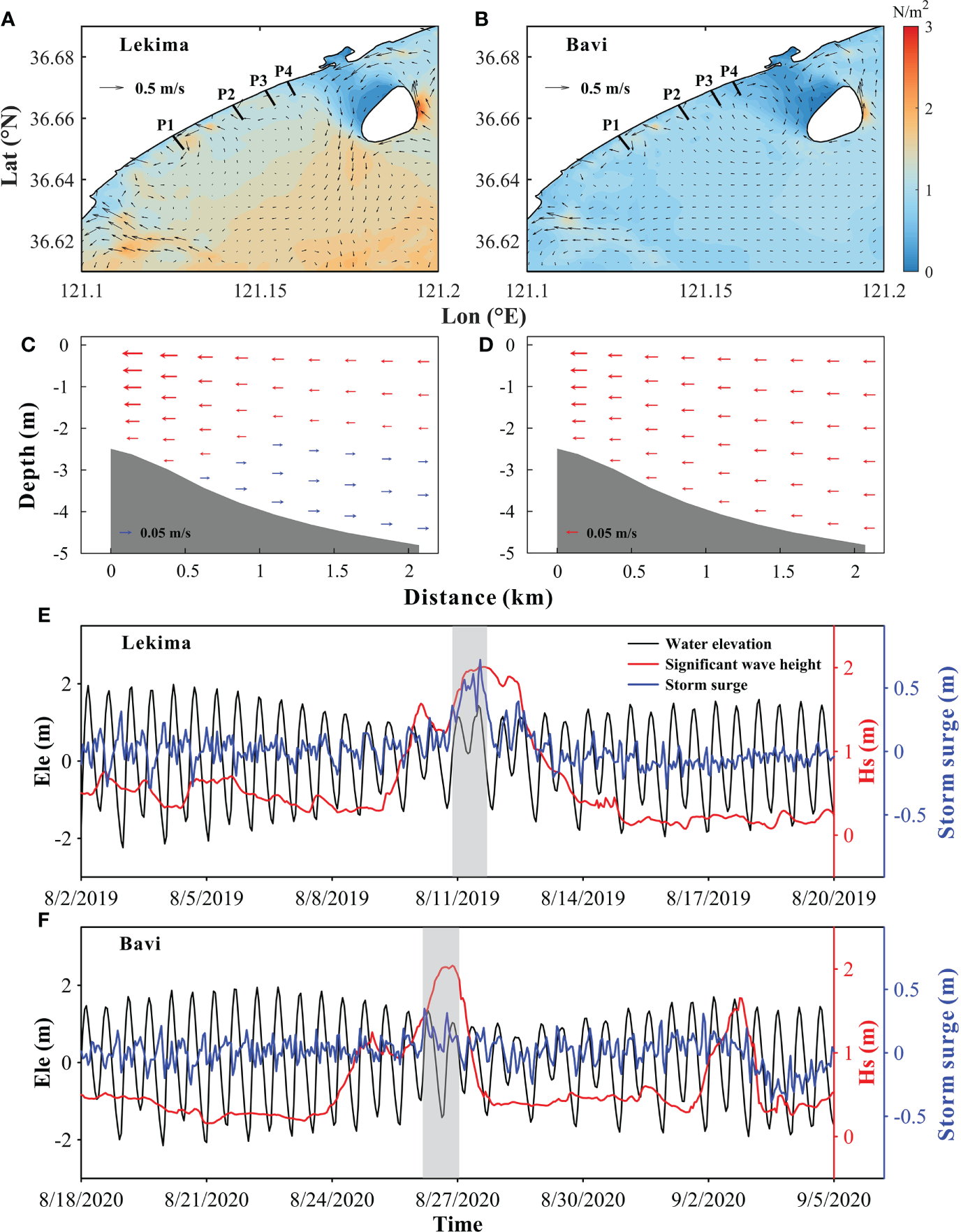 13h averaged surface residual currents (arrows) and bottom shear stress (colored) induced by Lekima (A) and Bavi (B), respectively, and vertical distributions of residual currents at profile P2 with red arrows indicated onshore and blue arrows indicated offshore during these two events (C, D). Time series of simulated water elevation (black line), significant wave height (red line) and storm surge (blue line) at Station C2 during Lekima (E) and Bavi (F), respectively. The gray areas represent the periods when storm surge were higher than 0.3 m and 0.1 m, respectively, which we refer to as the ‘strong-effect period’ of the two TCs.