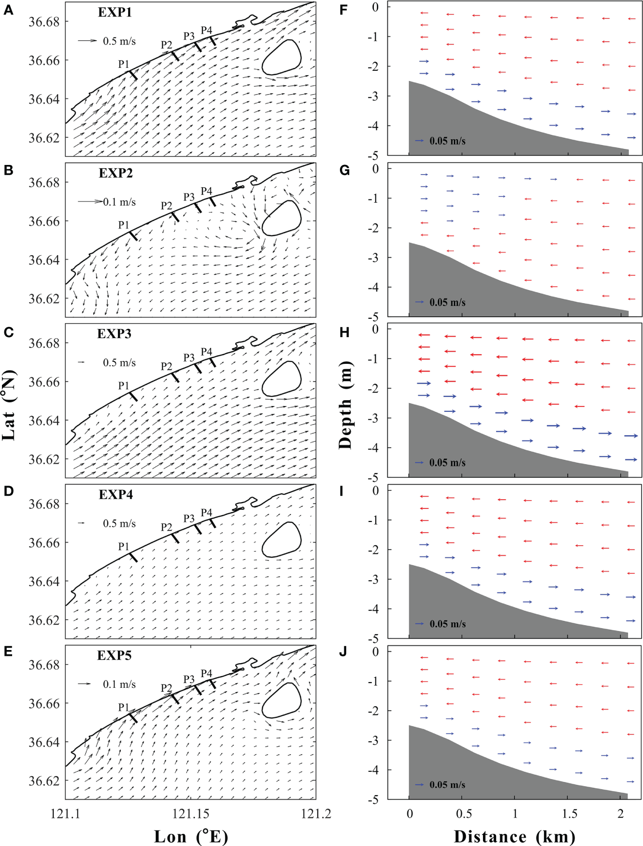 25h-averaged surface residual currents and vertical distribution of residual currents at P2 profile with red arrows indicated onshore and blue arrows indicated offshore in Exp.1 (A, F), Exp.2 (B, G), Exp.3 (C, H), Exp.4 (D, I) and Exp.5 (E, J), respectively.