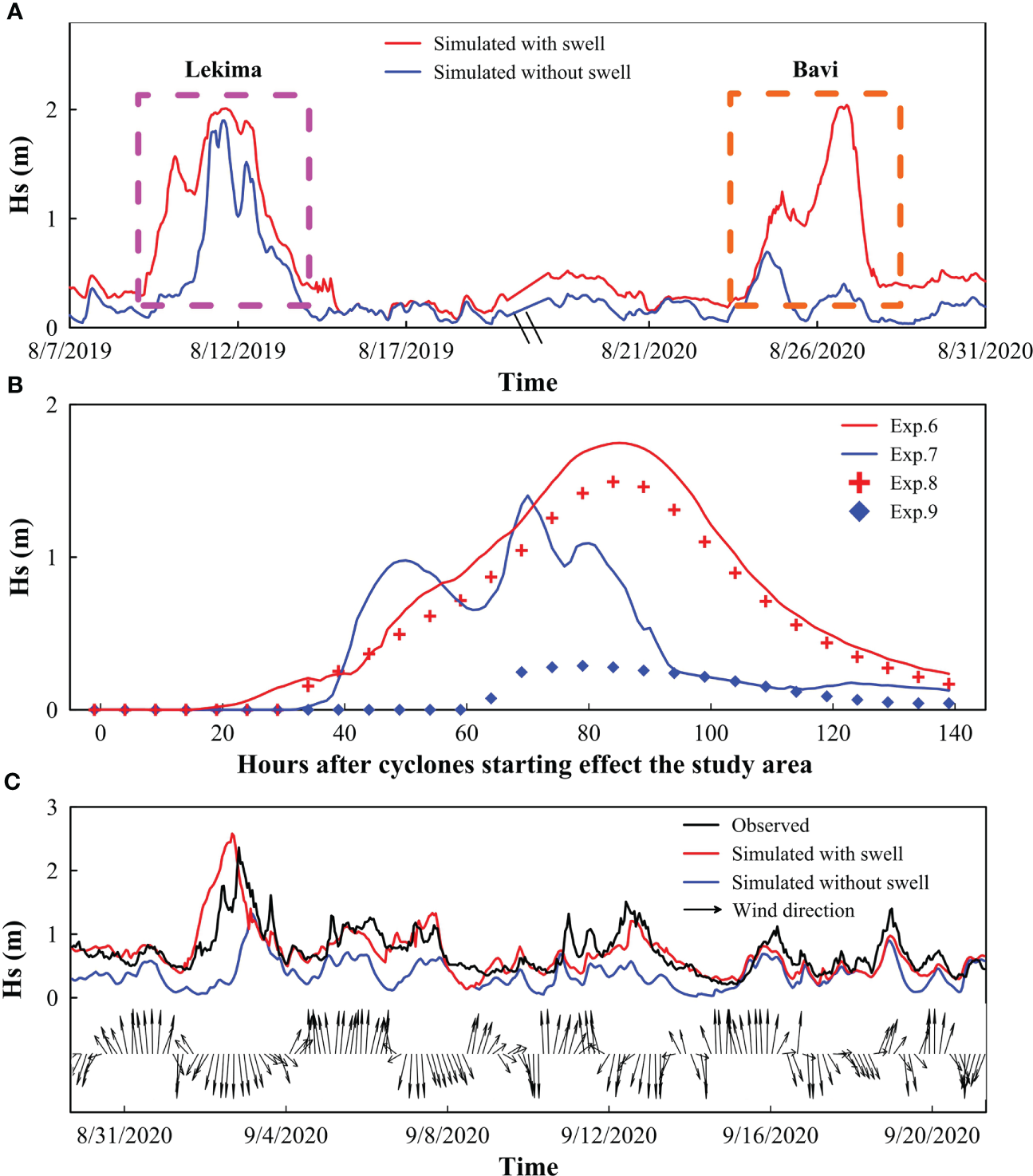 As shown in Figure 8, similar significant wave height (Hs) can be found during Lekima and Bavi, though the wind speeds were very different. Thus two additional simulations for these two cyclones were conducted without swell to examine the contribution of swell. The Hs didn’t change a lot with or without swell during Lekima, however, the Hs was very different during Bavi (Figure 8A). A set of sensitive experiments with or without swell (Exp.6 to Exp.9 in Table 2) were also designed. Similar results can be concluded that swell contributes most to the waves induced by right-pass cyclones (Exp.7 and Exp.9 in Figure 8B). This indicated that though the wind wave height was small during offshore wind, the swell from out seas was comparatively large. This can also be demonstrated in the simulation of Hs during Lekima and Bavi. Without the effect of swell, Hs during Bavi which the wind direction is seaward is relatively small.