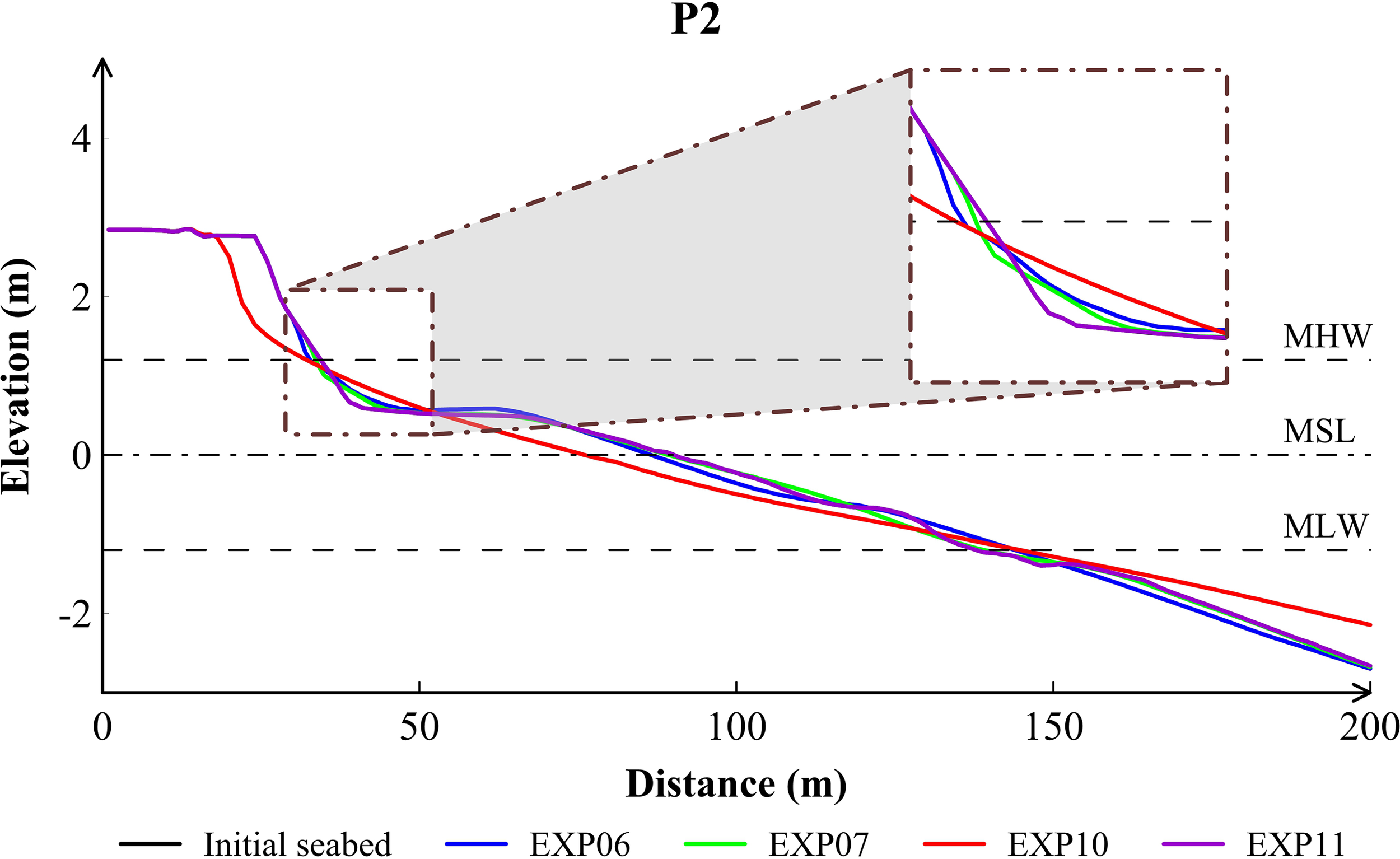 Beach topography was investigated using RTK-GPS (Real Time Kinematic- Global Positioning System) with horizontal and vertical precisions of 2.5 mm and 5 mm, respectively. A total of four repeated topography observations were conducted, as presented in Table S1. At each profile, the observed resolution was less than 3m which would be reduced where the topography changed rapidly.