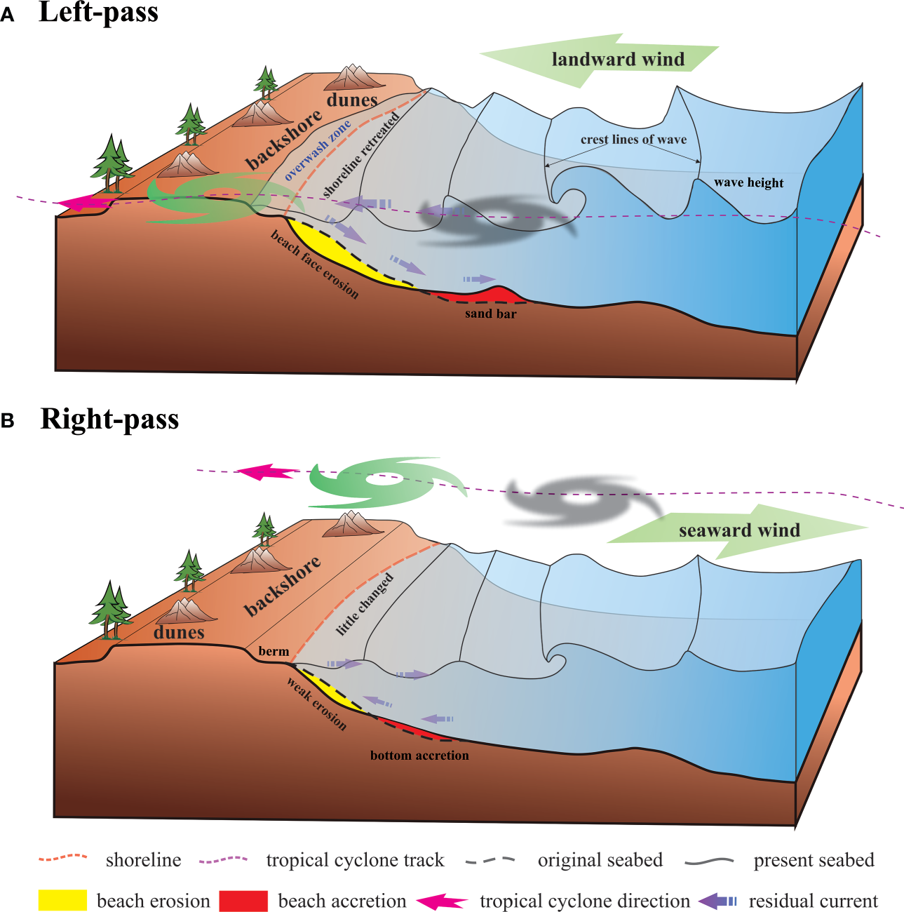 About 31% of the ice-free shoreline in the world is sandy and more than 24% of the sand beaches are suffering serious erosion at a rate of more than 0.5 m/year (Luijendijk et al., 2018). Tropical cyclones (TCs) have the potential to create, destroy, or substantially modify coastal landforms, especially in sand-dominated systems (Sherman et al., 2013). They can disrupt longshore and cross-shore sediment transport balances within short periods by inducing storm surges and strong waves. Thus, dune and sand bar systems can be rapidly, and even irreversibly, destroyed (Sallenger, 2000; Houser et al., 2008; Arifin and Kennedy, 2011). Compared with the monsoon storms, the wave intensity and storm surge can be significantly enhanced during TCs (Shariful et al., 2020), which could cause drastic erosion in dunes and berm where sediments were transported by strong undertow to form the sandbars (Roelvink et al., 2009; Armaroli et al., 2013).