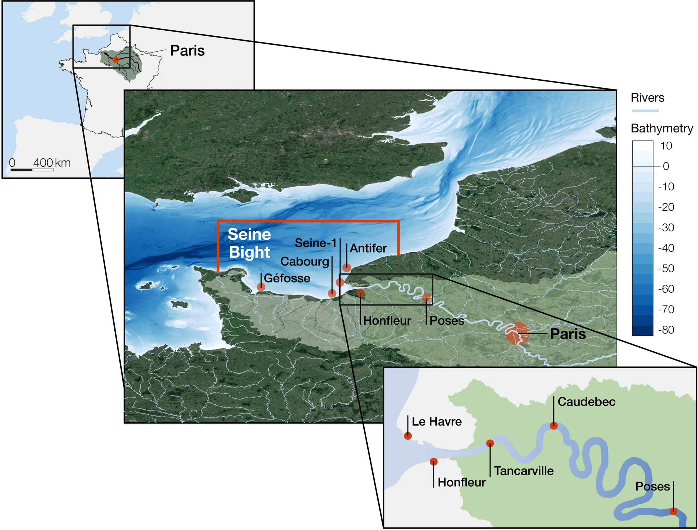 At its lower end, the river becomes a large estuary. The Seine estuary is a macrotidal temperate estuary of about 50 km2, with an intra-estuarine basin that drains 4515 km2, ca. 6% of the total surface of the catchment (Garnier et al., 2013). Two sections can be clearly distinguished: a freshwater tidal sector –from Caudebec up to Poses, where a lock prevents further tidal propagation–, and a lower part affected by a salinity gradient (Garnier et al., 2010b; Fisson et al., 2014). The mean residence time in the estuary spans from 5–7 days to ~18 days (for a flow of 1000 m3 s-1 or 200 m3 s-1 at Poses, respectively; Le Hir, 2001; Even et al., 2007). The estuary is also characterised by the formation of a turbidity maximum zone (TMZ), mostly located between Honfleur and Tancarville (Etcheber et al., 2007; Garnier et al., 2008). The location of the Seine basin within France, the estuary, and the coastal area included in the present study are shown in Figure 1.