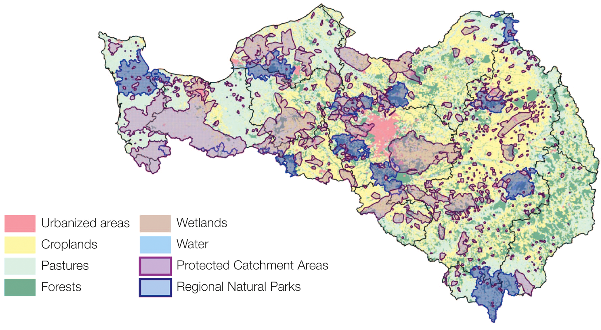 Land use in the Seine River catchment, showing the location of Protected Catchment Areas (PCA) and Regional Natural Parks (RNP). [Sources: AESN, Corine Land Cover 2006, IGN-GEOFLA, INPN].