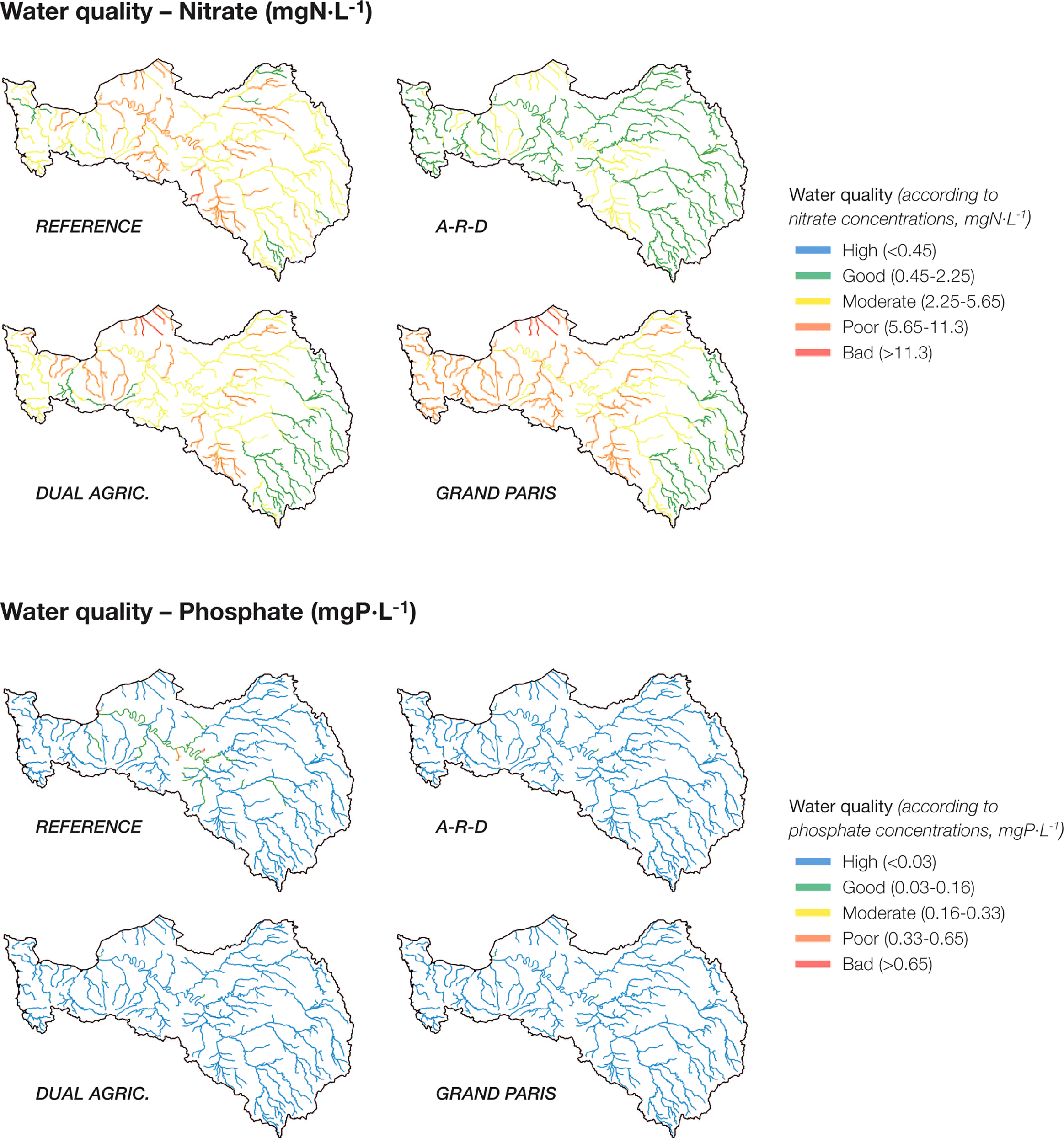 The effects of the different scenarios in terms of the concentration of nutrients (nitrate and phosphate) along the hydrographic network are shown in Figure 3. In the reference conditions, nitrate values >2.25 mg N/L (>160.7 µmol/L) are widespread in the catchment, and concentrations exceed 5.6 mg N/L (400 µmol/L) in the main branch. These values correspond to the Moderate and Poor environmental status as set in European regulations (European Directives 2000/60/EC and 2008/105/EC). All three future scenarios show some improvement in water quality with respect to the reference conditions. For Grand Paris, water quality improves in the upper part of the basin but gets worse in the lower part, where most of the tributaries show nitrate concentrations >5.6 mg N/L. Nitrate values in the main branch remain between 2-6 mg N/L, mainly on account of continuous technological upgrades in wastewater treatment infrastructures.