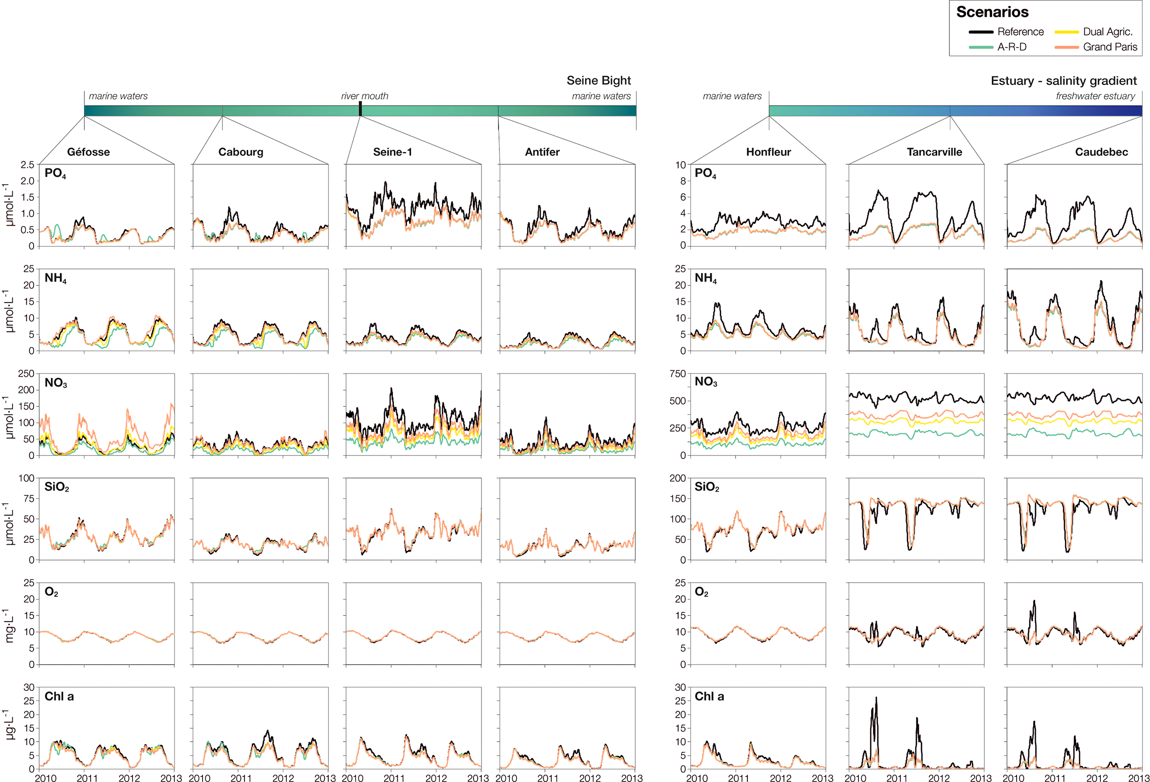 The changes between scenarios in riverine nutrient concentrations propagate to the estuary and the nearby coastal waters. In Caudebec –at the intersection between the freshwater estuary and the brackish estuary– and Tancarville –downstream, within the brackish estuary– there are large decreases of phosphate, ammonium and nitrate in all three scenarios with respect to the reference conditions (Figure 5). The nutrient decrease entails a decline in chlorophyll: summer peaks of 15-25 µg·L-1 drop to maxima <10 µg·L-1. Moreover, there is little variation between scenarios, except for nitrate, for which the concentration gradient observed at Poses (Grand Paris > Dual Agriculture > A-R-D scenario) persists. The differences in nutrients and chlorophyll are somewhat smoothed out, but still apparent at Honfleur, at the outlet of the estuary.