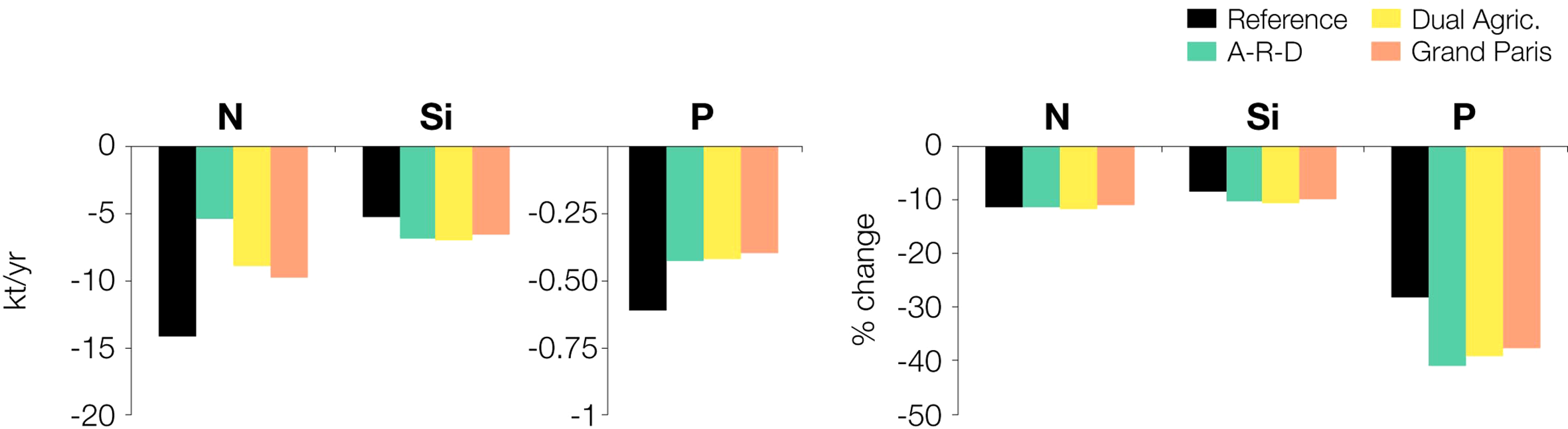 The shifts in the agro-food system put forward in our scenarios not only have profound effects in terms of water quality, they also cause large variations in the total nutrient fluxes that reach the estuary and are exported to the sea. Results for the Reference scenario are in accordance with the estimates by Romero et al. (2019). On average for the 10-year period, about 126 kt N yr-1, 62 kt Si yr-1 and 2.6 kt P yr-1 enter the estuary annually at Poses, and 112 kt N yr-1, 57 kt Si yr-1, and 1.9 kt P yr-1 are exported from Le Havre to the adjacent sea. This means that the filtering capacity is ~10% for N and Si, and 28% for P (Figure 6). The fluxes of silicate –which does not come from anthropogenic sources– barely change between the three scenarios and the reference (<6% difference in the fluxes, the filter effect remains around 10%), but the scenarios decrease significantly the loads of P and N entering and leaving the estuary. In the A-R-D projection, inputs are 48 kt N yr-1 and 1.3 kt P yr-1, and outputs are 42 kt N yr-1 and 0.8 kt P yr-1 (less than half the reference values). The N retention capacity is only slightly higher (-11%) than in the reference conditions, but it increases to -41% in the case of P, against the 28% above. Intermediate retention values are found for the other two scenarios: -11% N (9-10 kt N yr-1), and -38% P (0.4 kt P yr-1) in the Grand Paris and Dual Agriculture projections.