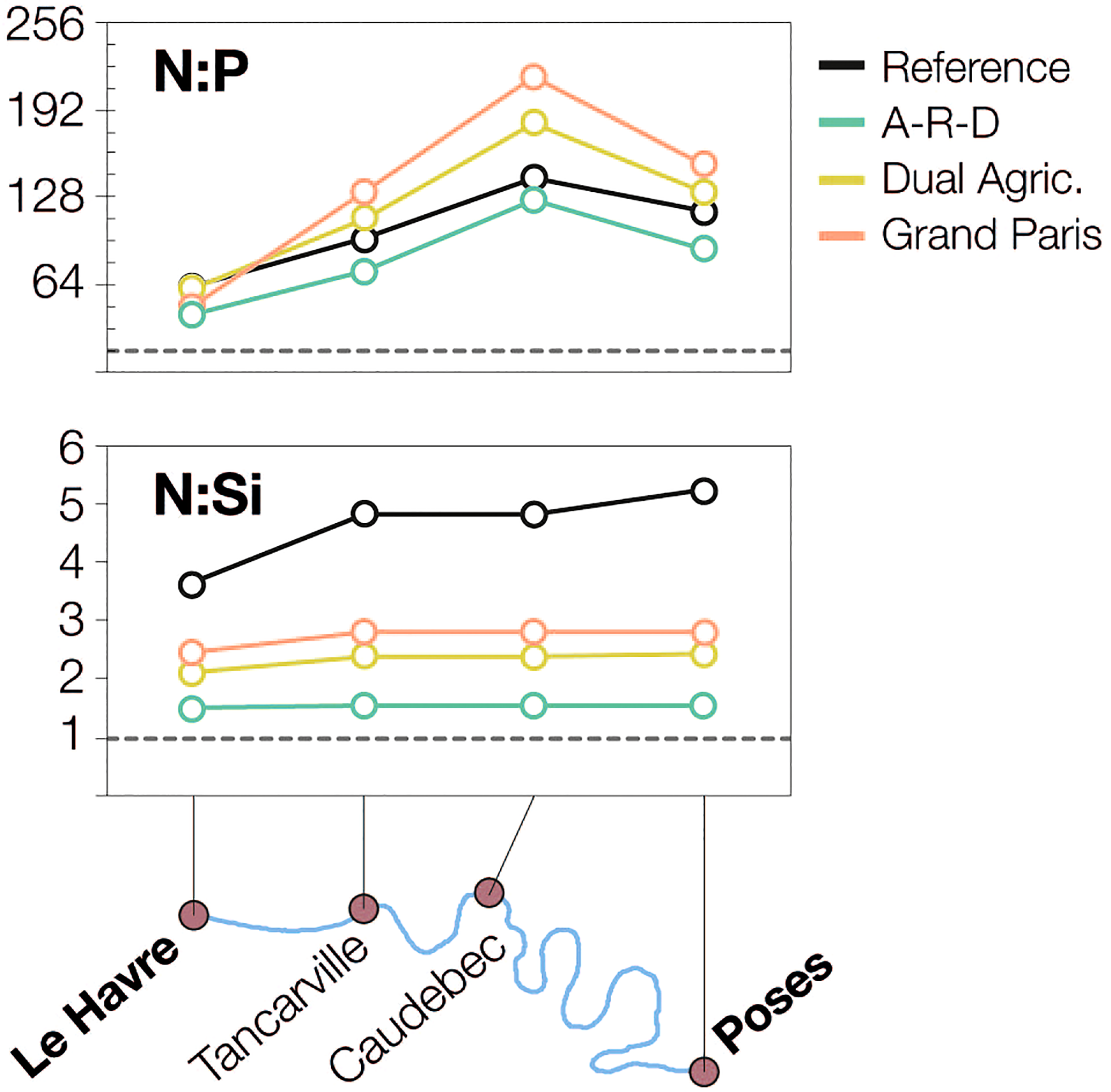 We calculated the relative ratios of N:P and N:Si at several stations along the estuary (Figure 7). For the reference, both N:P and N:Si values are remarkably above the Redfield values (N:P = 16; N:Si = 1). N:Si ratios decrease from 5.3 to 3.7 as waters flow downstream into the estuary, while N:P peaks at Caudebec (N:P = 143), at the furthest upstream point where we have the influence of marine waters. The A-R-D scenario is the only one that brings both ratios down towards the Redfield standard; N:Si falls to 1.5 (-66%), and the decrease in N:P averages -23% (-11% at Caudebec, where values remain high (127); -33% at Le Havre, where the ratio drops to 41). N:P increases swiftly in the Dual Agriculture and the Grand Paris scenarios, reaching values of 184 and 218 at Caudebec, respectively, and reinforcing the current imbalance.