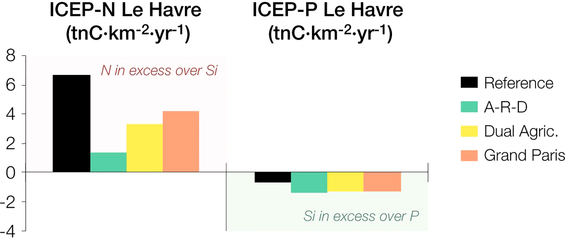 The results show positive ICEP-N values at Le Havre for the reference and the three scenarios, which means that once Si is depleted, there are N leftovers that can be used by non-siliceous algae. The lowest ICEP-N and thus the lowest potential eutrophication risk corresponds to the A-R-D scenario. In contrast, the ICEP-P is negative in all cases, implying that P may be limiting primary production and acting as a natural firewall for algal blooms.