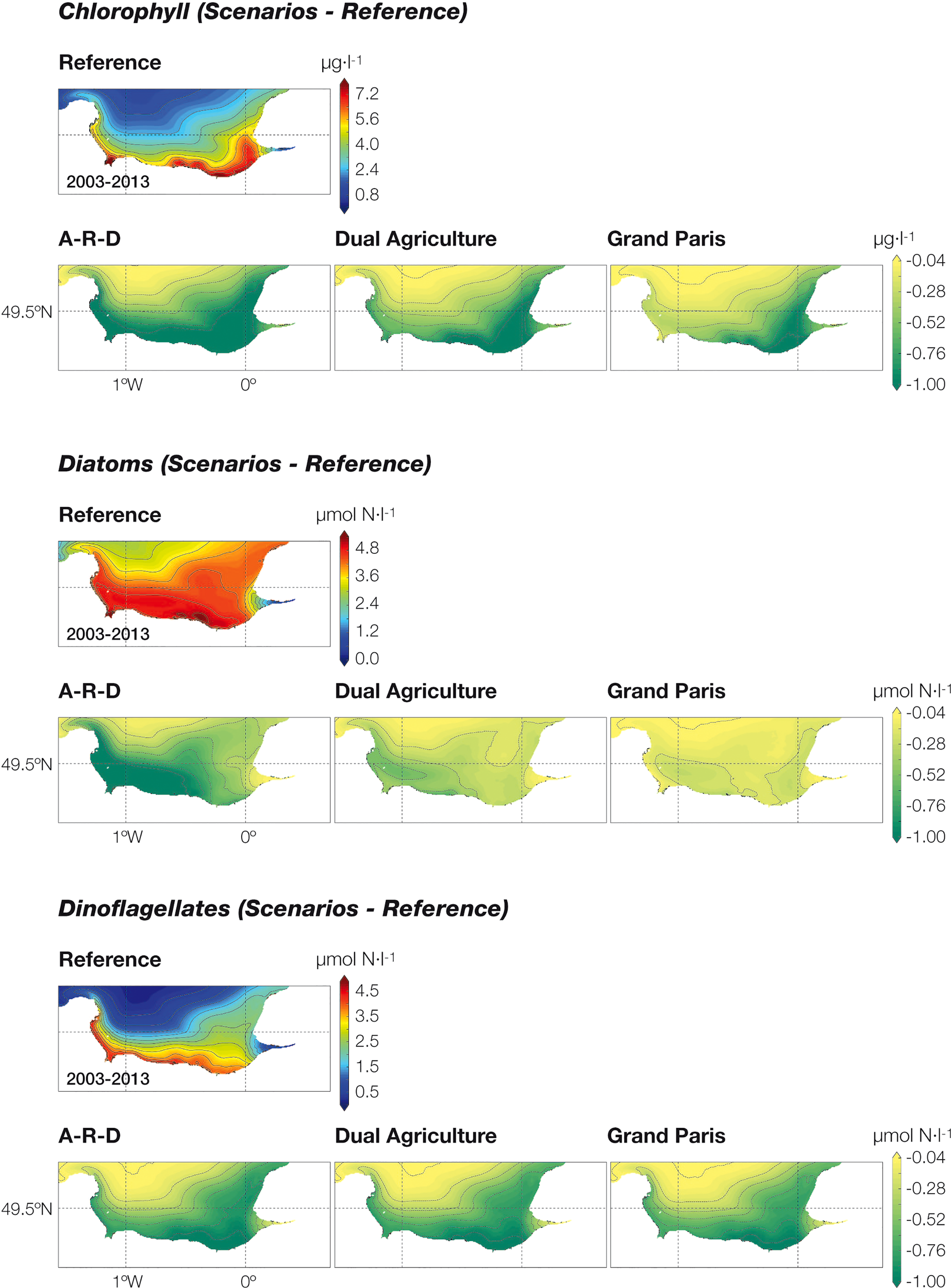 Concentration of chlorophyll, diatoms and dinoflagellates (expressed in µmol N·l-1) in the Seine Bight (average values for the 2003-2013 period). Note that, in order to highlight the divergences, we have plotted the difference between the reference situation and the outcome of each scenario.