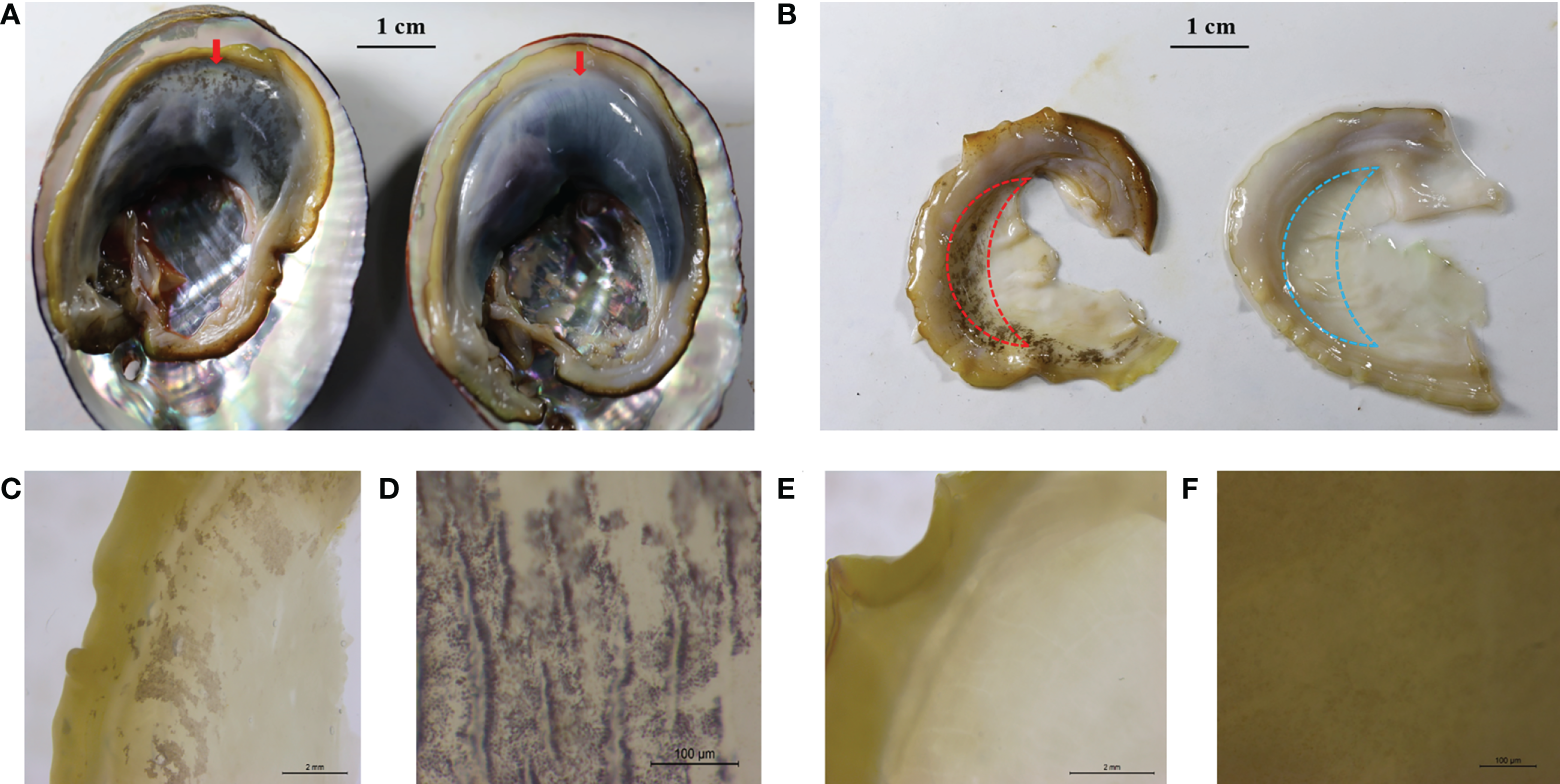 Representative mantle marking morphs. (A) An individual with black mantle markings (left, the red arrow) and an individual without black mantle markings (right, the red arrow) recorded with a digital camera, scale 1 cm. (B) Mantle with black markings (left) and mantle without black markings (right) recorded with a digital camera, scale 1 cm. Red and blue dashed lines indicate the sampling locations of RNA-seq. (C) Black mantle markings under the microscope, scale 2 mm. (D) Black mantle markings under the microscope, scale 100 μm. (E) Mantle without black markings under the microscope, scale 2 mm. (F) Mantle without black markings, scale 100 μm.