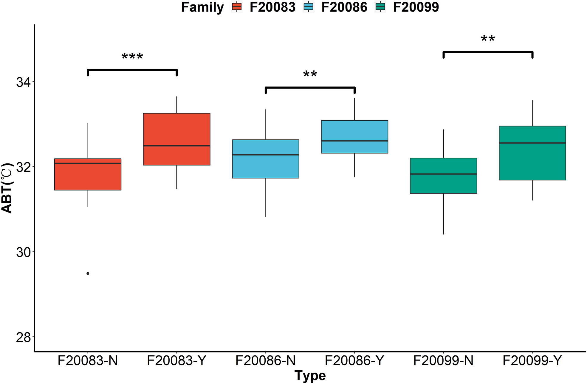 The ABT values differed between the two groups in three families (Figure 2). The ABT values of the Y group (F20086-Y: 32.66 ± 0.58°C; F20083-Y: 32.61 ± 0.73°C; F20099-Y: 32.42 ± 0.75°C) were significantly higher than the N group (F20086-N: 32.14 ± 0.66°C; F20083-N: 31.87 ± 0.72°C; F20099-N: 31.80 ± 0.64°C) in three DF×SS families (p < 0.05). This indicated that individuals with mantle markings are more heat-tolerant than those without mantle markings.