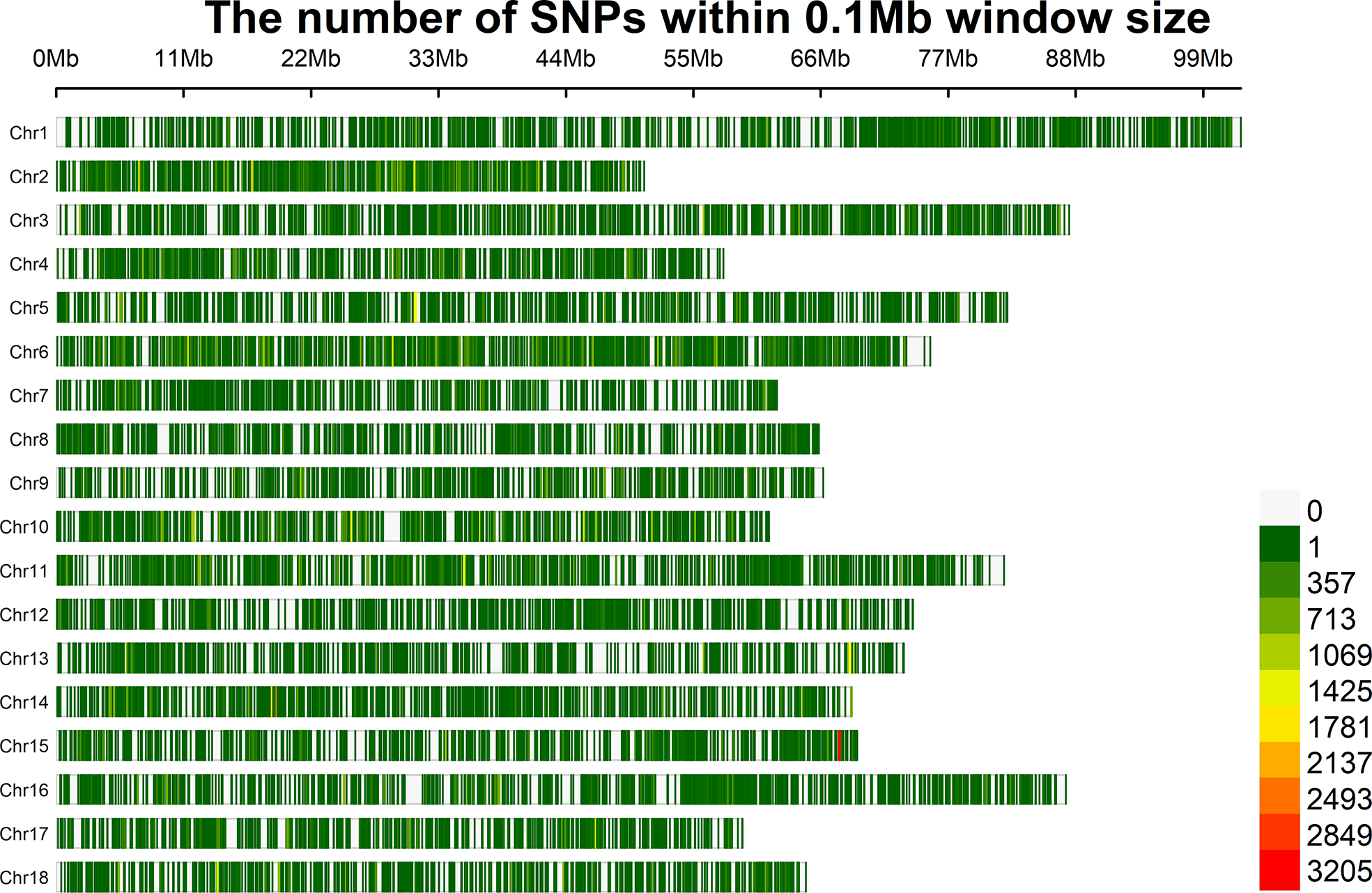 Distribution of SNPs on each chromosome (the number of SNPs within 0.1 Mb window size).