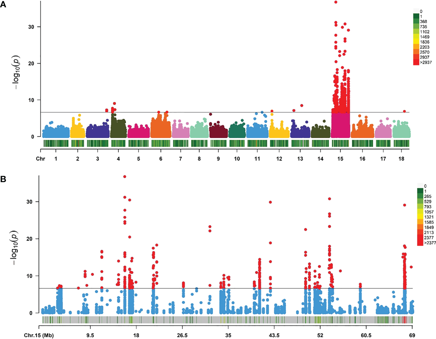 Manhattan plots of genome-wide association study (GWAS) analysis. (A) GWAS for mantle markings with 603,067 single-nucleotide polymorphisms (SNPs) in three-way cross abalone (p < 2.32E–07). (B) GWAS for mantle markings with 10,116 SNPs on Chromosomes 15 in three-way cross abalone (p < 2.32E–07).