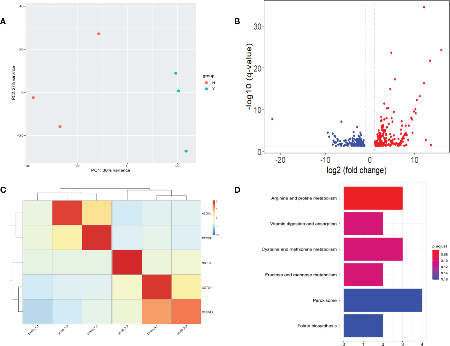 In total, an average of 32.66 million raw reads and 31.13 million clean reads per sample were obtained through RNA-sequencing. A PCA based on the whole-genome gene expression profiles showed that two groups were clearly separated in the PC1-PC2 score plot (Figure 5A), with PC1 explaining 36% and PC2 explaining 27% of the total variance. Between the Y and N groups, a total of 413 DEGs were identified. Of these, 252 genes were upregulated and 161 were downregulated in group Y relative to group N (Figure 5B). In addition, 276 of the DEGs could be annotated on the green abalone genome, including PTPRT (receptor-type tyrosine-protein phosphatase T), DDT-b (D-dopachrome decarboxylase-B), ATOX1 (copper transport protein ATOX1), SLC6A3(sodium-dependent dopamine transporter), and GSTO1(glutathione S-transferase omega-1) (Figure 5C). The results of the KEGG pathway enrichment analysis showed that those 413 DEGs were enriched in vitamin digestion and absorption, cysteine and methionine metabolism, and peroxisome and folate biosynthesis (Figure 5D).