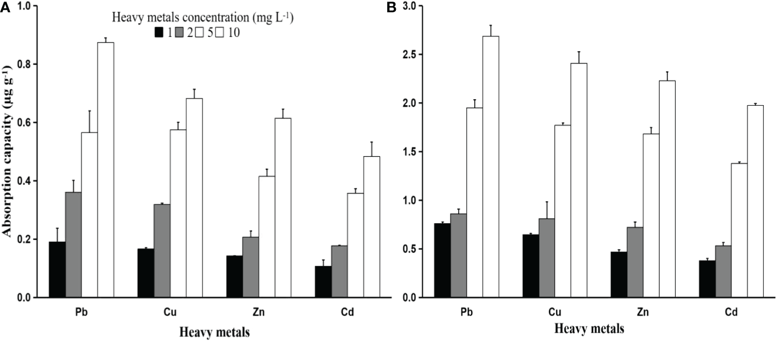 Heavy metals (Pb, Zn, Cu, and Cd) absorption capacity (µg g-1) of PS of different sizes 50 µm (A) and 250 µm (B) after 24 hours of exposure to different heavy metal concentrations (1, 2, 5, and 10 mg L-1).