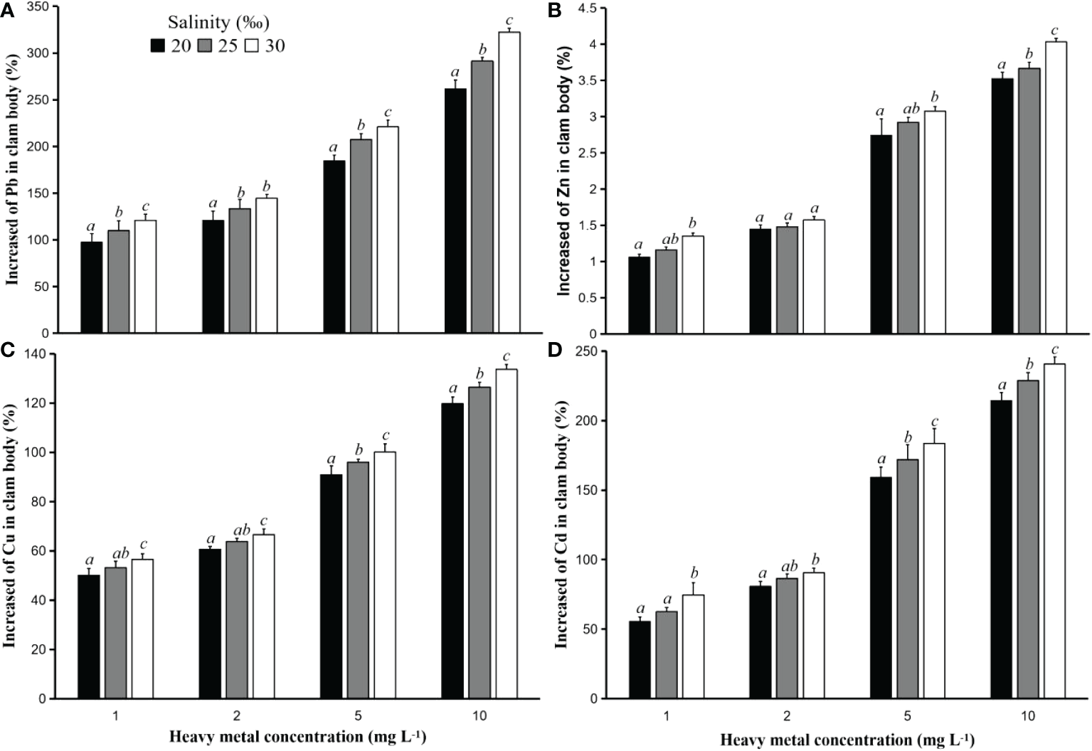 Increased heavy metal concentrations (%) Pb (A), Zn (B), Cu (C), and Cd (D) in the hard clam (M. lusoria) body after 24 hours of exposure to PS particles with a size of 50 µm that had contact with heavy metals at various concentrations (1, 2, 5, and 10 mg L-1) and salinities (20, 25, and 30‰). The data for increased heavy metal concentrations in clam body with different letters (a, b, and c) differed significantly (p<0.05) between salinities.