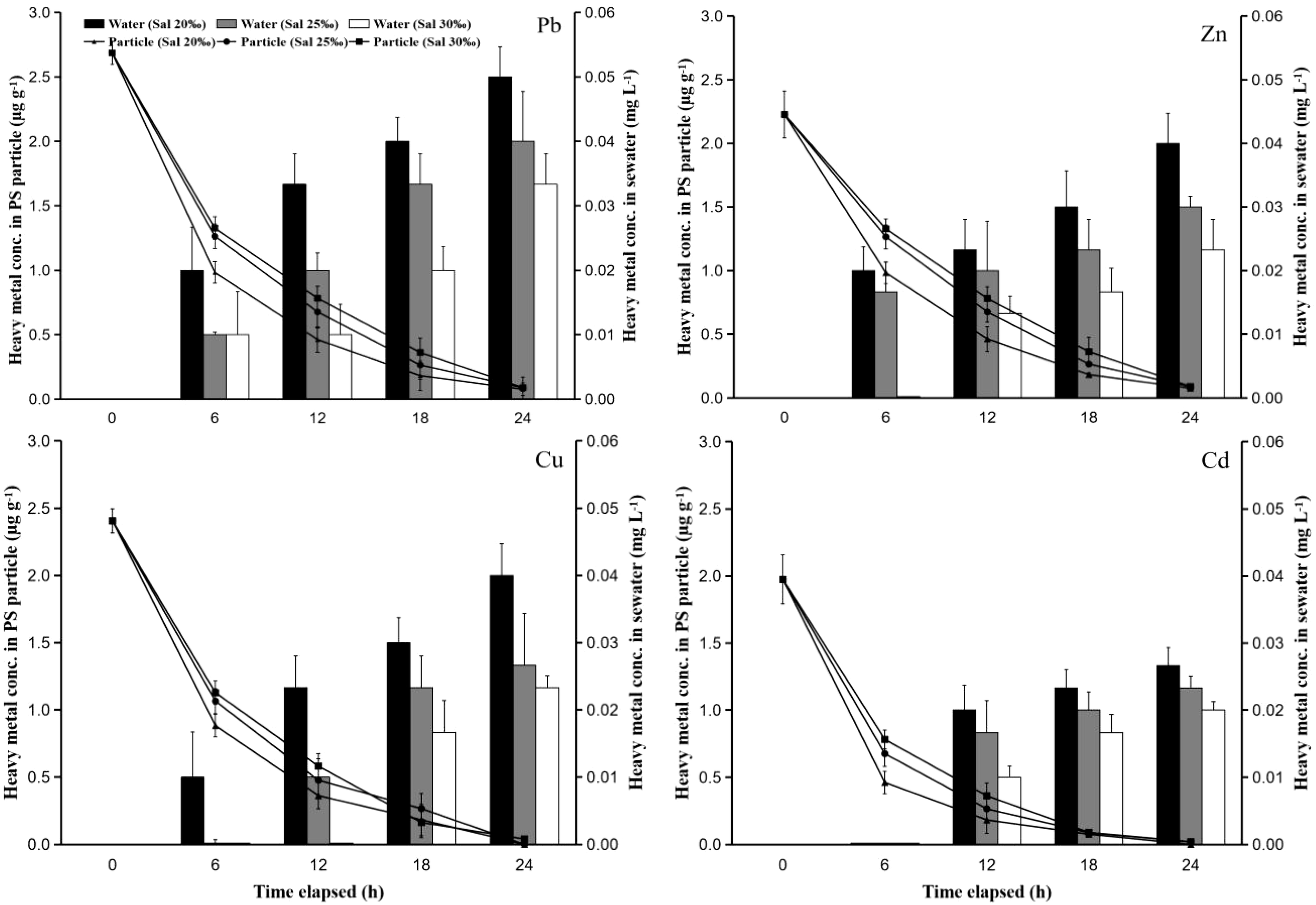 The time-course changes of heavy metal concentrations remaining in PS particles and water at the test used PS particles with a size of 50 µm that had contact with heavy metals at concentrations of 10 mg L-1 and different salinities (20, 25, and 30‰).