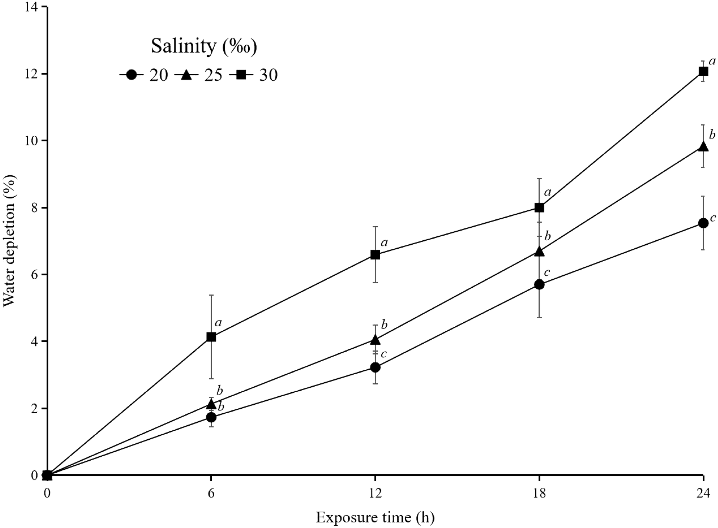 Water depletion (%) after exposure with hard clam (M. lusoria) (n=10) at different times dan salinities (20, 25, and 30‰). The data for water depletion (%) with different letters (a, b, and c) differ significantly (p<0.05) between salinities.