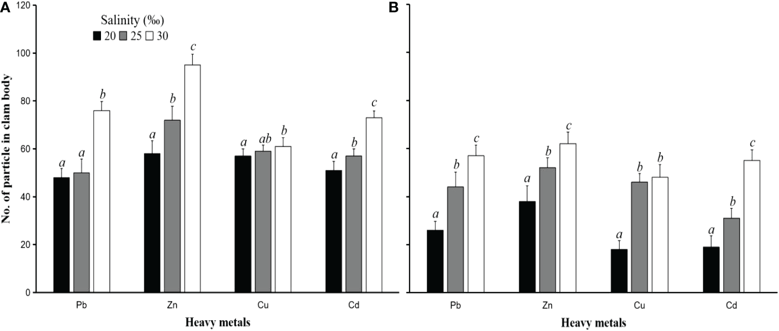 The number of PS particle sizes 50 µm (A) and 250 µm (B) accumulated in the hard clam body (M. lusoria) after contact with heavy metals (Pb, Zn, Cu, and Cd) with an initial concentration 10 mg L-1 at various salinities of 20, 25, and 30‰ after 24 hours of exposure time. The number of particles in the clam body with different letters (a, b, and c) differs significantly (p<0.05) between salinities.