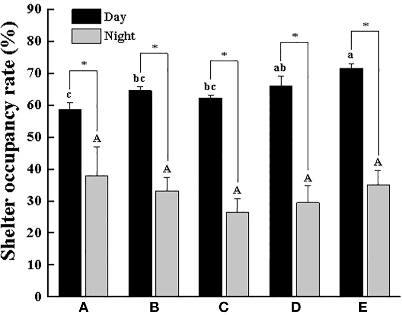 Shelter occupancy rate of swimming crab with different body weight groups in the presence of shelters. Different letters indicate significant differences among different body weight groups (P < 0.05) and “*” indicates significant differences between day and night (P < 0.05).