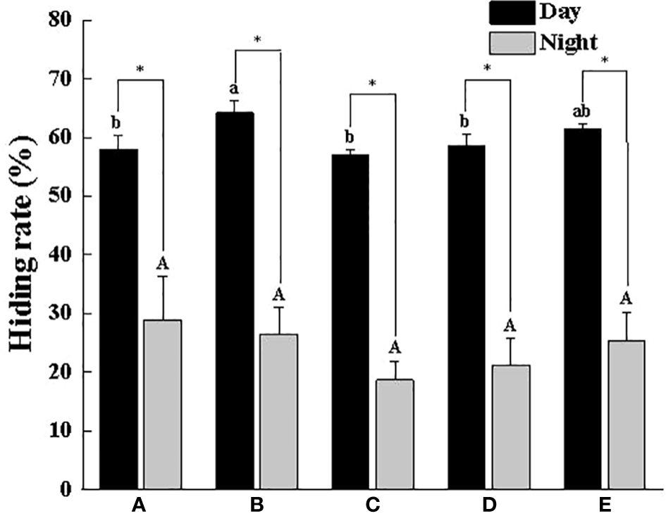 Hidden rate of swimming crab with different body weight groups in the presence of shelters. Different letters indicate significant differences among different body weight groups (P < 0.05) and “*” indicates significant differences between day and night (P < 0.05).
