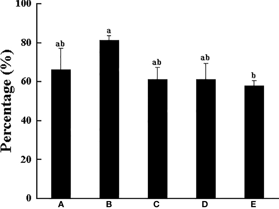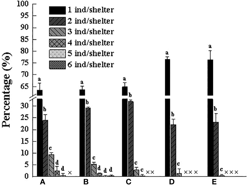 Figure 2 shows the SOR in the daytime (58.58%~71.52%) was significantly higher than that at night (26.50%~37.92%). Overall, with the increase in the body weight of the crab, the SOR gradually increased during the daytime, especially in Group E, which was as high as 71.52%, a value that was significantly higher than that in Groups A, B and C (P < 0.05). As for the HR, it is also significantly higher in the daytime than at night, but the difference in each group was small, basically between 57.14% and 64.20%, of which Group B had the highest HR in the daytime (64.20%), followed by Group E with 61.40% (Figure 3). In addition, we found that there were different numbers of crabs in a single shelter, including 1 ind/shelter, 2 ind/shelter, 3 ind/shelter, 4 ind/shelter and 5 ind/shelter. In Group B, there were even 6 ind/shelter, while in Groups D and E, there were at most 3 crabs in a shelter, and most individuals occupied one shelter alone. Furthermore, if other crabs try to enter the shelter where crabs were already present, the crab in the shelter will open their chelipeds to deter and drive the invaders away. Therefore, other crabs that fail to occupy the shelter can only be forced to hide around the outer shelter wall or the cement pool wall. By comparison, the proportion of multiple individuals in a shelter in the smaller body weight group (Groups A, B and C) was significantly higher than that in the larger body weight group (Groups D and E), and the probability of 1 ind/shelter in the larger body weight group (Groups D and E) was high up to 77% (Figure 4). As a whole, the proportion of multiple crabs in a shelter decreased as the body weight of crabs increased.
