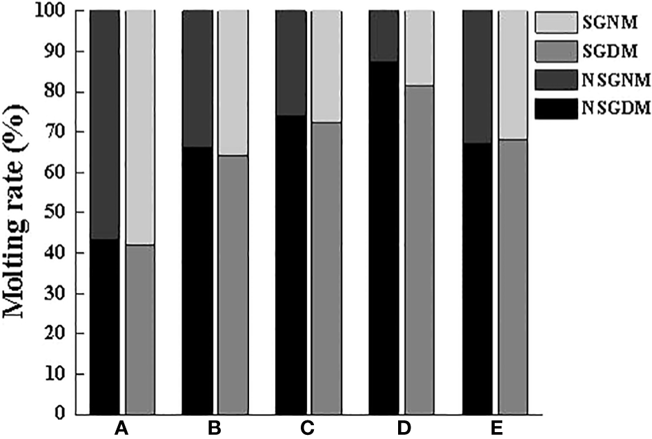 Molting rate of swimming crab in daytime and at night with different body weight groups in the presence and absence of shelters. NSGDM, No shelter group molting during the day; NSGNM, No shelter group molting during the night; SGDM, Shelter group molting during the day; SGNM, Shelter group molting during the night.