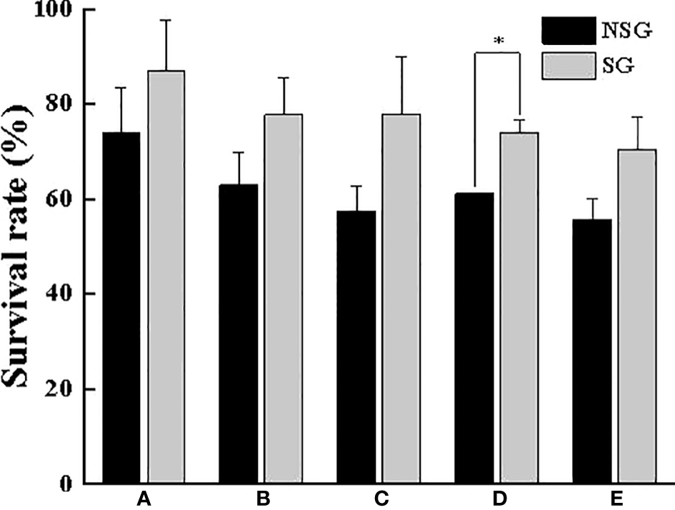 Survival rate of swimming crab with different body weight between NSG and SG. “*” indicates significant difference (P < 0.05).