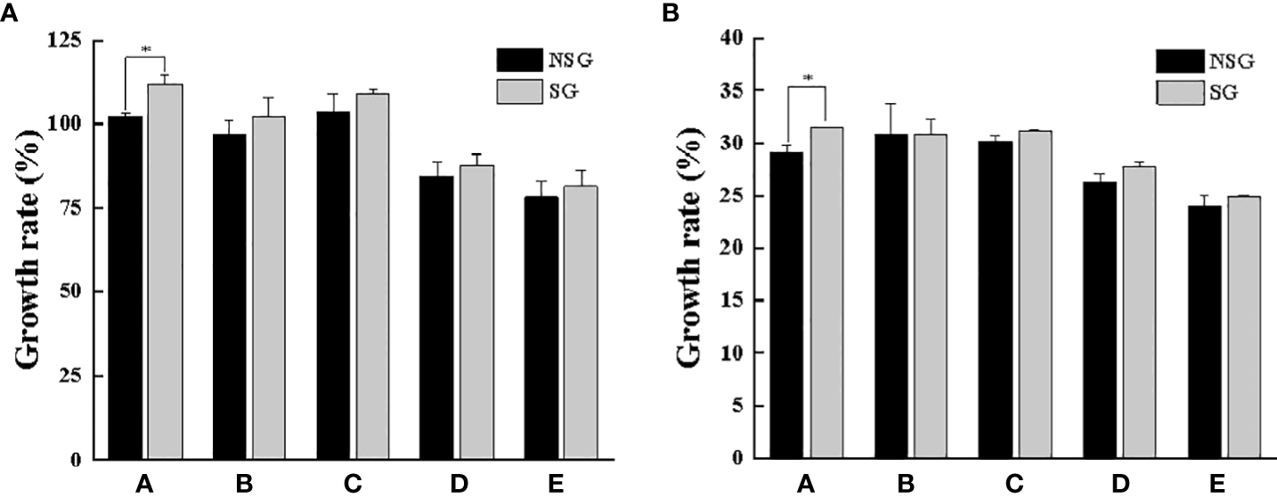 Growth rate of body weight (A) and carapace width (B) of swimming crab with different body weight between NSG and SG. “*” indicates significant differences (P < 0.05).