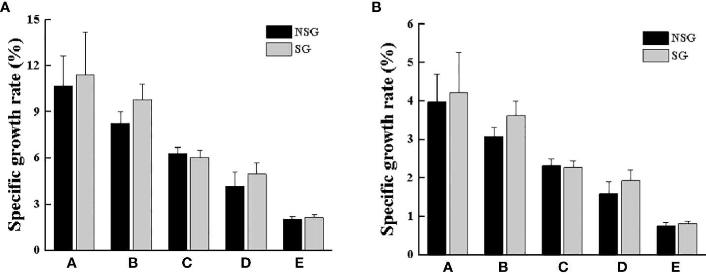 Specific growth rates of body weight (A) and carapace width (B) of swimming crab with different body weight between NSG and SG. Unmarked letters indicate no significant differences (P > 0.05).