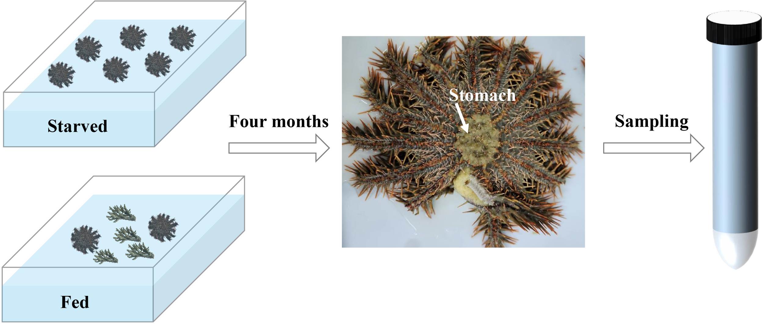 Fifty-two adult CoTS were collected from the South China Sea near Tanmen (Hainan, China) on August 2021 during the spawning season and separated gently into two groups in an indoor recirculating aquaculture system (4 x 4 x 1.2 m3) with filtered seawater (temperature = 23.5 ± 0.8°C, salinity = 30.4 ± 2.9 ppt) at Tropical Aquatic Research and Development Center (Hainan, China). To minimize the coral consumption, fed group was constituted of three randomly selected adult CoTS fed with artificially bred corals (mainly Acropora, coral supply was replenished after its complete consumption) (Caballes et al., 2016), while the starved group contained forty-nine CoTS reared without any feeding. After four months, six starfishes that survived starvation were randomly selected as six replicates for the starved group. Together with two out of three CoTS survived with feeding (starved for 0 days, control group), stomach tissues were collected through anatomy (Figure 1). Obtained tissue samples were labeled and fast frozen in liquid nitrogen before being sent to the laboratory (Guangzhou, China) with dry ice and stored at -80°C.