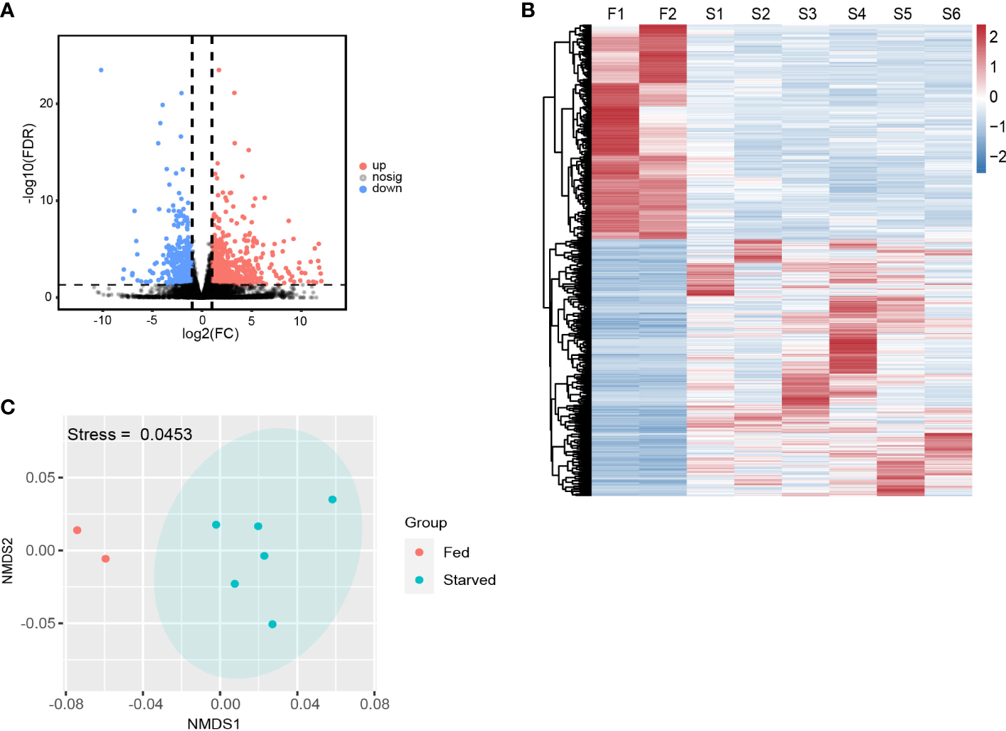 Overall DEGs expressions in starved and fed CoTS. (A) Volcano map of differential genes in transcriptome (FDR < 0.05, |log2(fold change)| ≥ 1). (B) Heatmap of the DEGs in fed and starved CoTS individuals (F = fed CoTS, n = 2; S = starved CoTS, n = 6). (C) Nonmetric multidimensional scaling (NMDS) plot of DEGs among fed and starved CoTS individuals.