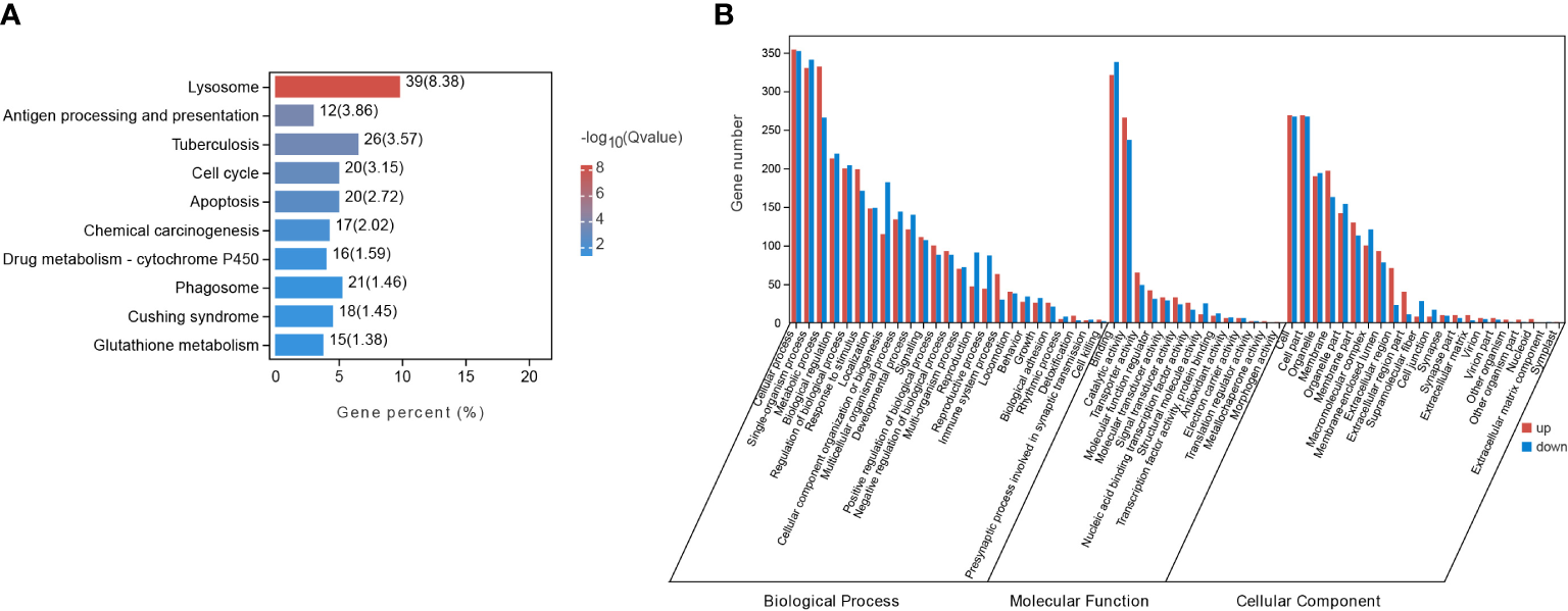 DEGs enrichment analysis in starved and fed CoTS. (A) Top 10 of KEGG enriched pathways. (B) Histogram of GO enriched genes in transcriptomes.