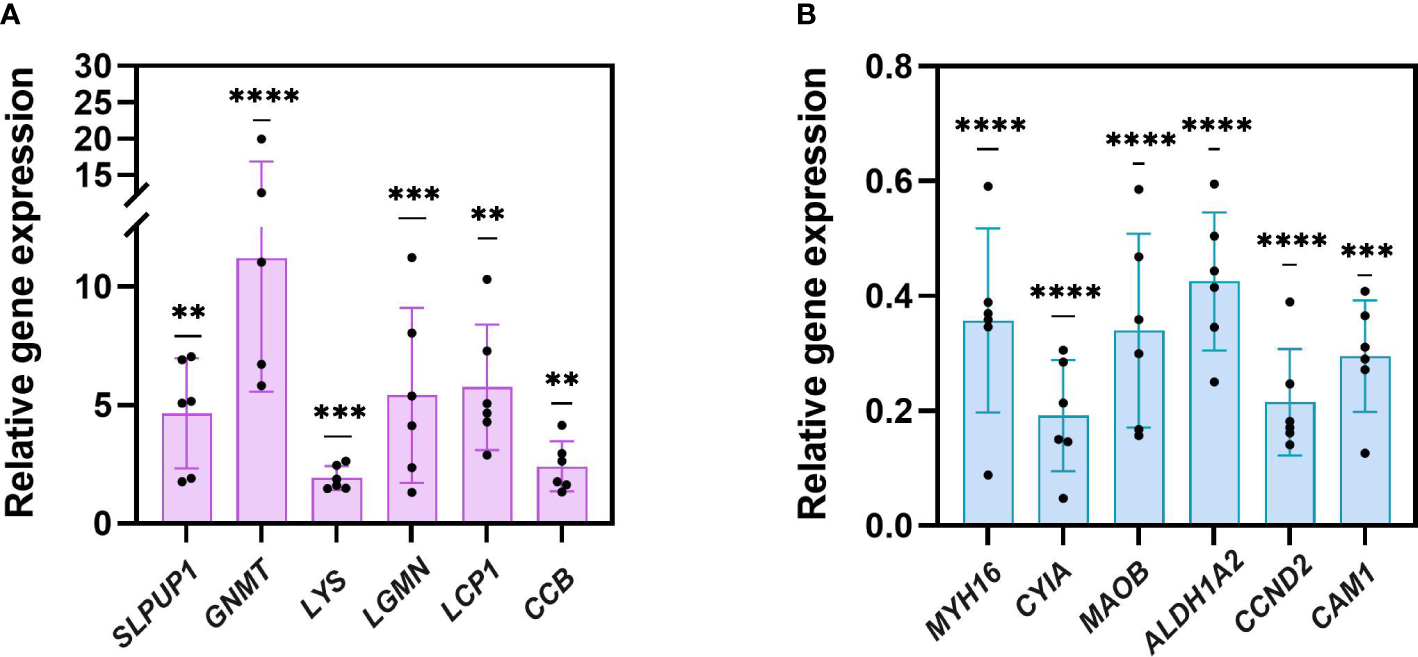 qRT-PCR verification of 12 genes. (A) six upregulated genes. (B) six downregulated genes (**p < 0.005, ***p< 0.001, ****p < 0.0001).
