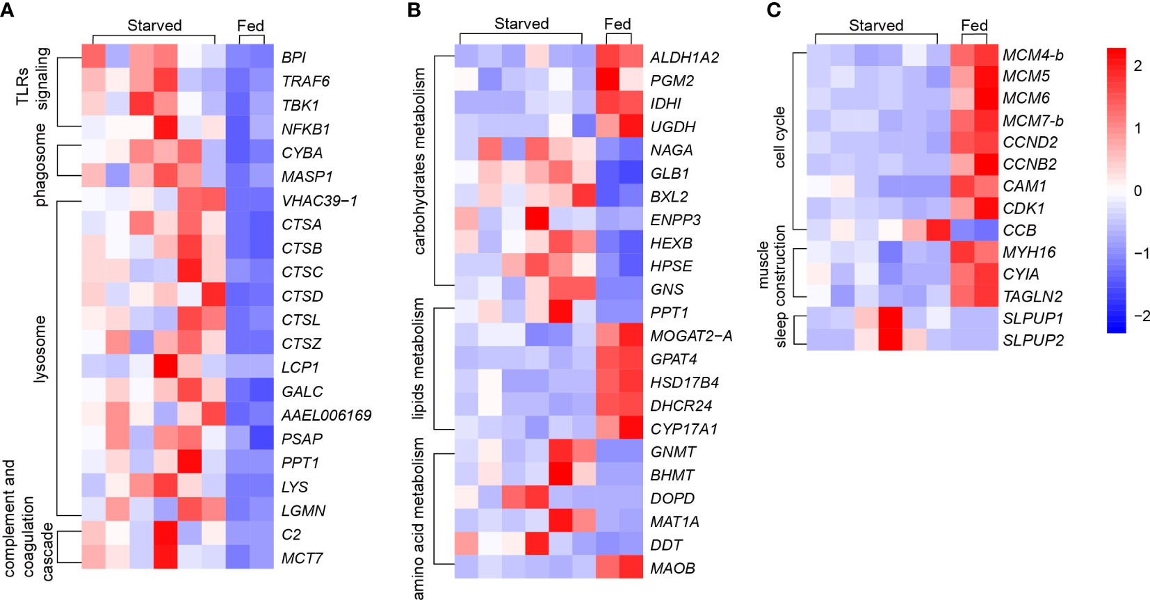 Changes of key genes under starvation in CoTS. (A) Immune responses: Toll-like receptors (TLRs) signing, phagosome, lysosome and complement and coagulation cascade. (B) Metabolism responses of carbohydrates, lipids and amino acids. (C) Other key changes of cell cycle, muscle construction and sleep.