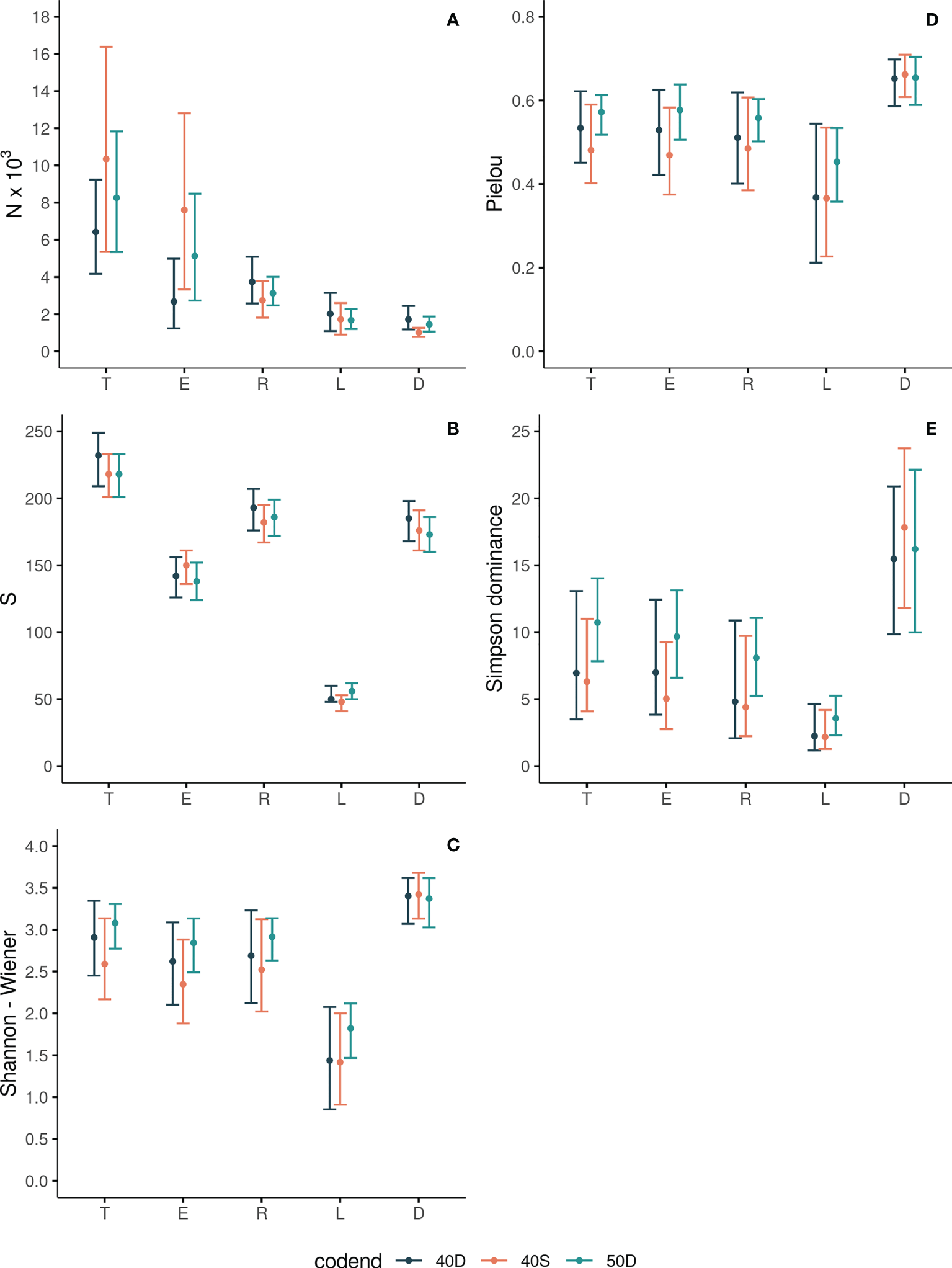 Abundance N (A), Species Richness S (B), Shannon-Wiener (C), Pielou (D) and Simpson Dominance (E) indices for the total assemblage entering the codend (T), escapees (E), retained catch (R), landings (L) and discards (D) for each tested codend (40D, 40S, 50D). The 95% CI are also shown with bars.