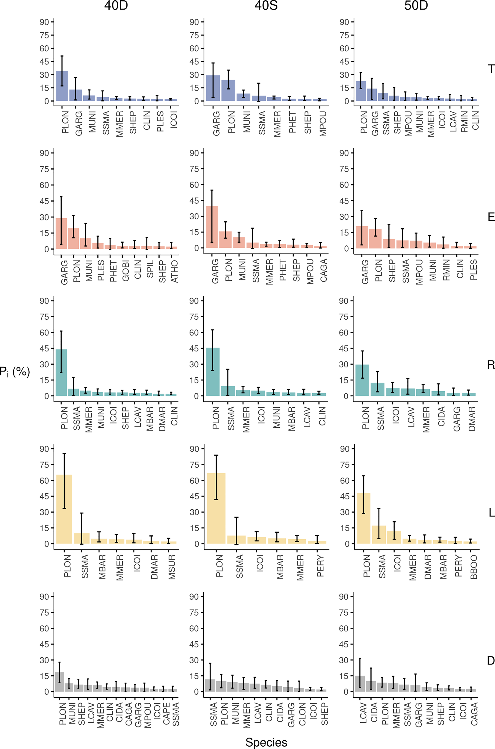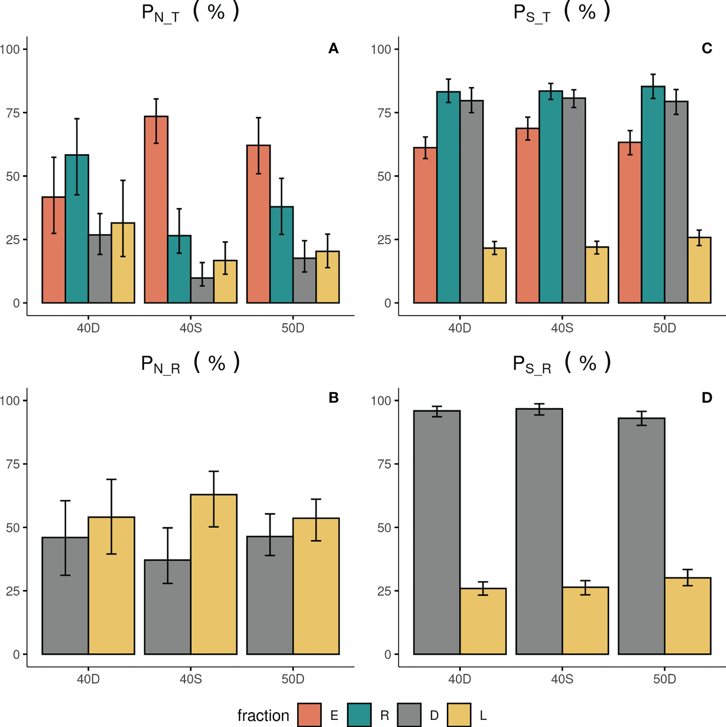 Percentage in Abundance PN_T(A) and Species Richness PS_T(C) in relation to the total assemblage entering each codend (T), and percentage in abundance PN_R(B) and Species richness PS_R(D) in relation to the retained catch (R) for the escapees (E), retained catch (R), landings (L) and discards (D). 40D, 40S, 50D: tested codends; the 95% CI are also shown with bars.