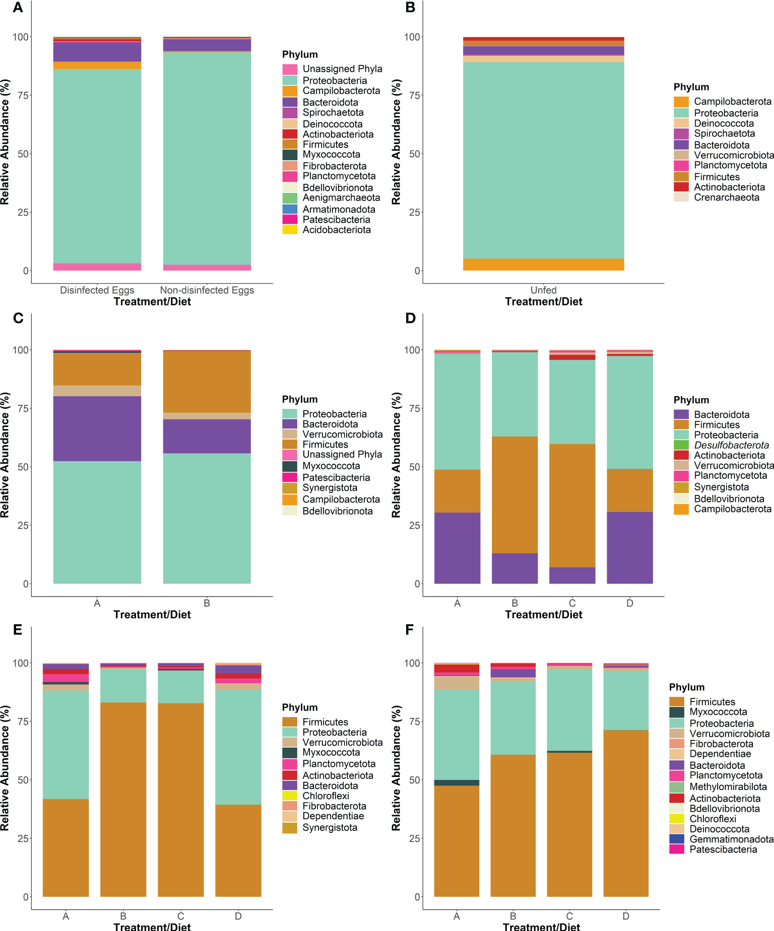 Phylum-level taxonomy of the internal bacterial microbiome of steelhead trout throughout a probiotic feeding regime. The 16S rRNA gene V4 region was sequenced at various points throughout the early lifecycle of steelhead trout at five timepoints where the total intestinal microbiome was examined: (A) T-1, (B) T0, (C) T1, (D) T2, (E) T3 intestinal homogenate samples. The adherent intestinal microbiome was analyzed at one time point: (F) T3 intestinal swab samples. Plots represent the top phyla comprising at least 90% of the total microbiome for all treatment groups. Bars were constructed using the average reads from samples specified as: five non-disinfected eggs, six disinfected eggs, 10 T0 internal homogenates, 10 T1 internal homogenates, eight T2 intestinal homogenates, 12 T3 intestinal homogenates, 10 T3 intestinal swabs for diets A, B, and D, and nine T3 intestinal swabs for diet C.