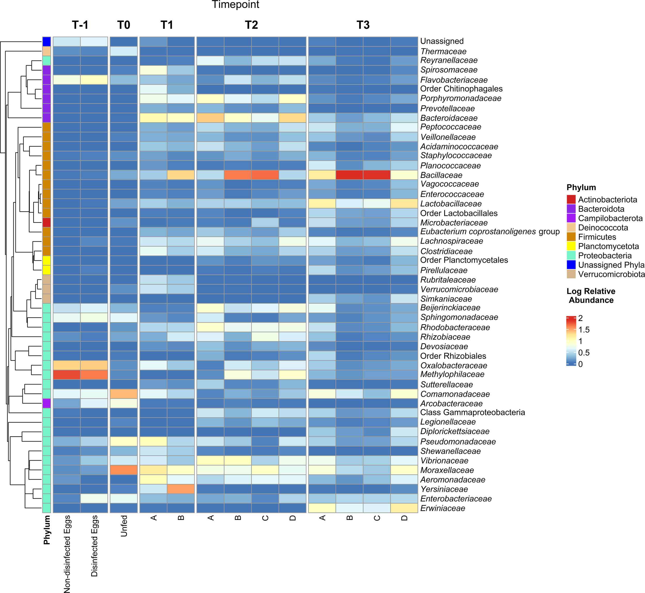 Family-level taxonomy of the internal bacterial microbiome of steelhead trout throughout a probiotic feeding regime. Following amplification of the 16S rRNA gene V4 region from fish internal GI samples collected at various timepoints during the early lifecycle of steelhead trout and fed one of four different diets (A, B, C, or D) or unfed eggs, the amplicons were sequenced via Illumina MiSeq. The log relative abundance of family-level taxa is plotted here. ASVs without family-level assignment are designated the higher classification as necessary. A QIIME2-generated phylogenetic tree was used to denote the phylogeny and phylum to which each family-level taxon belongs.