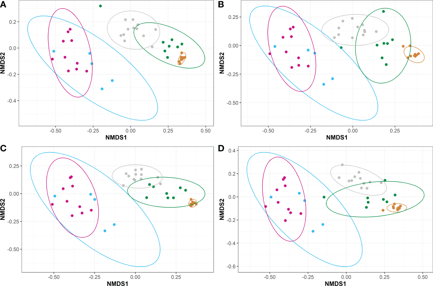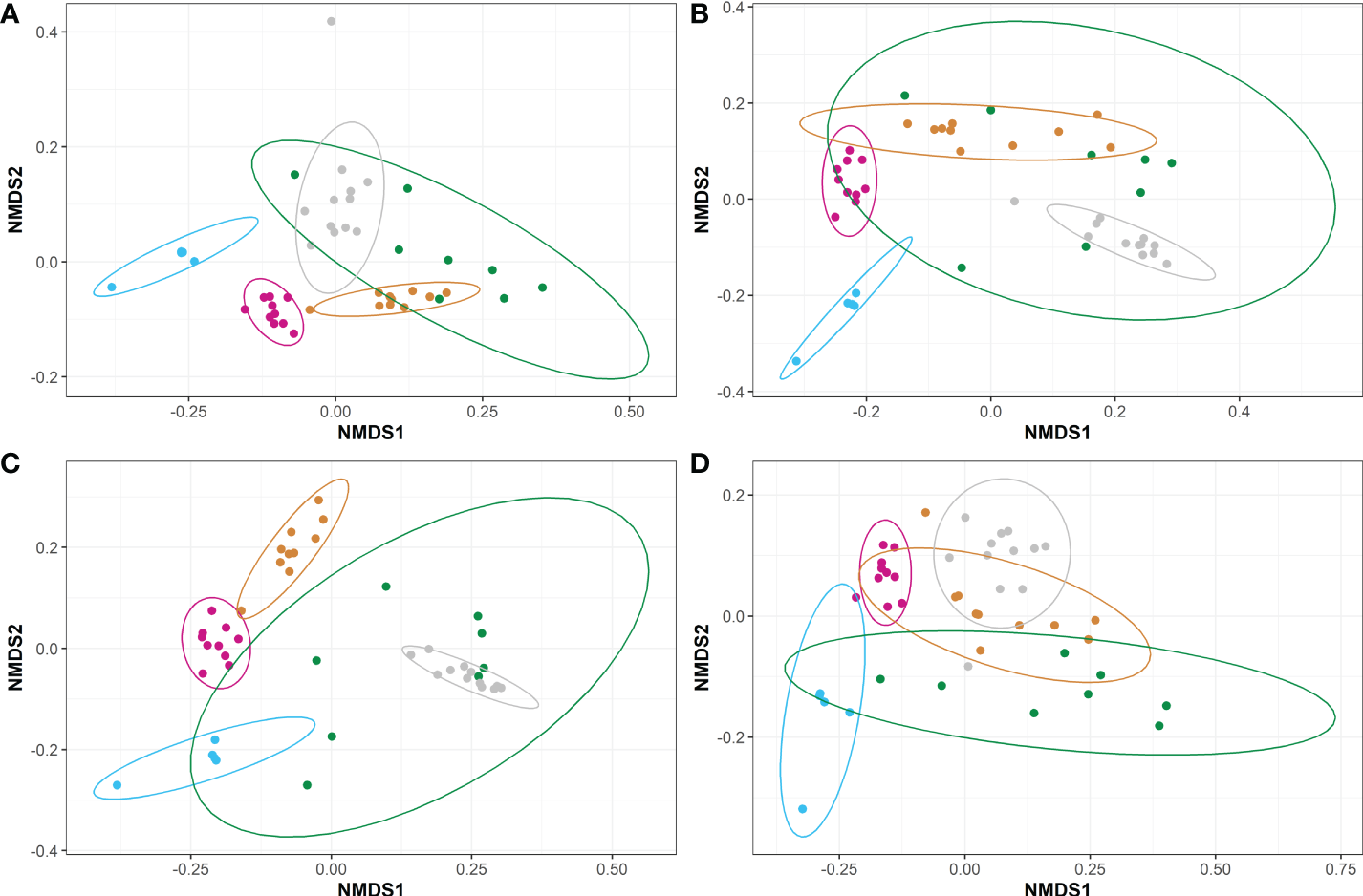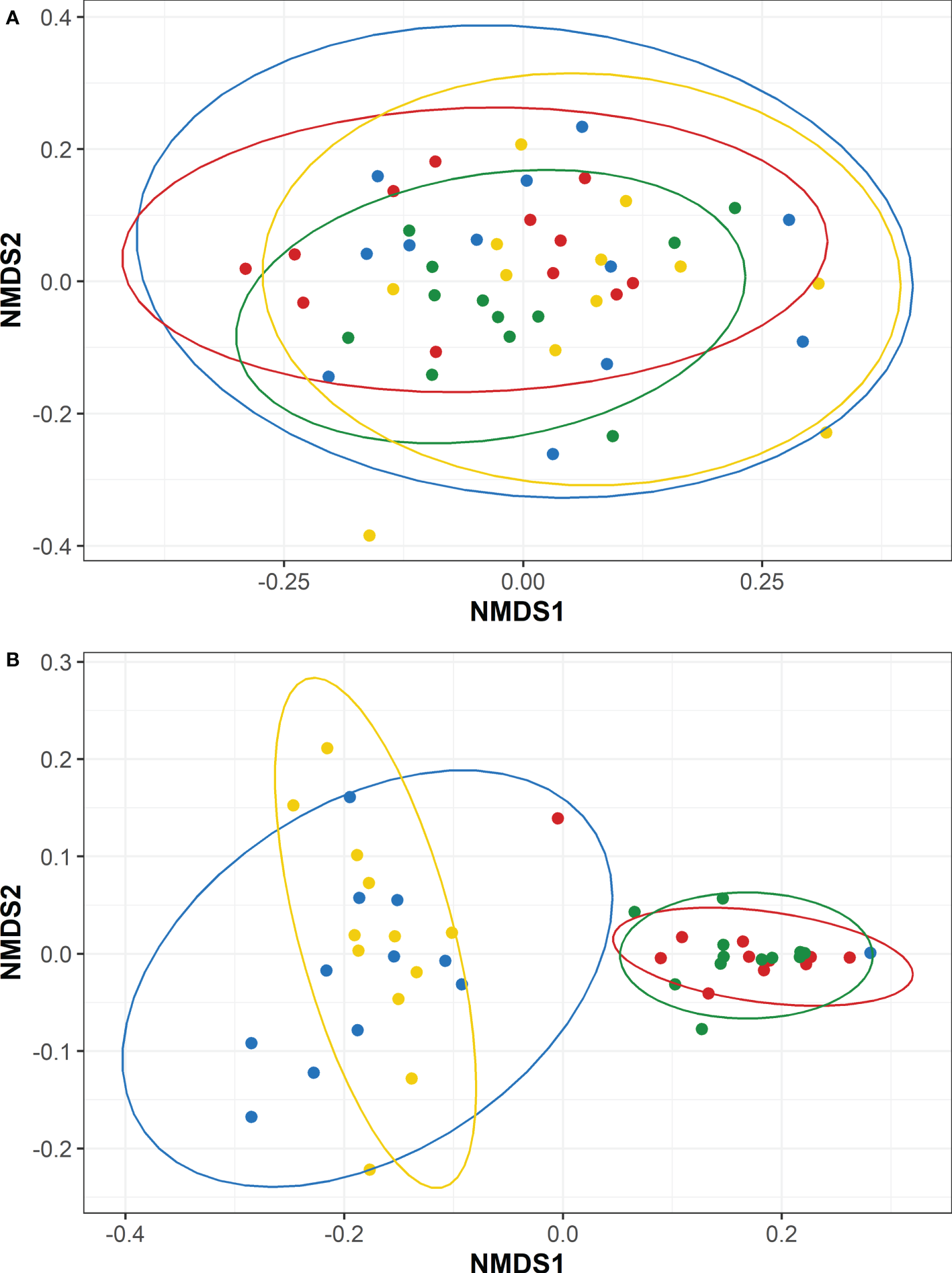 Taxonomic figures were created in R using several packages including qiime2R v.0.99.6 (Bisanz, 2018), phyloseq v.1.27.6 (McMurdie and Holmes, 2013), vegan v.2.5-7 (Oksanen et al., 2019, ggplot2 v.3.3.5 (Wickham, 2016), complexheatmap v.2.9.1 (Gu et al., 2016). Alpha diversities were calculated using the Shannon metric (measurement of the overall diversity with relative abundance factored in), evenness metric (determination of the relative dominance by ASVs), and observed ASVs (total number of ASVs present after filtering for each group) generated via QIIME2. Beta diversity non-metric multidimensional scaling (NMDS) visualization plots were created using inter-group microbiome dissimilarities calculated by the unweighted UniFrac (phylogeny-based beta diversity metric without relative abundances) and weighted UniFrac (phylogeny-based beta diversity metric including relative abundances) metrics, respectively within the phyloseq package (McMurdie and Holmes, 2013) in R.