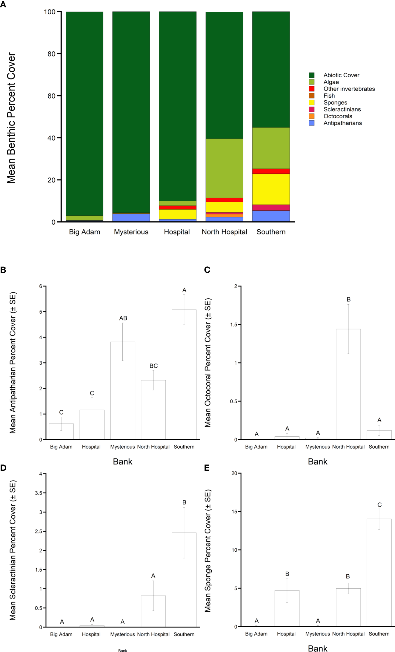 (A) Mean total percent cover of benthic groups from the five South Texas Banks surveyed. Subpanels show mean percent cover (± SE) of (B) antipatharians, (C) octocorals, (D) scleractinians, and (E) sponges. Levels not connected by the same letter are significantly different (Tukey’s HSD = >0.05).