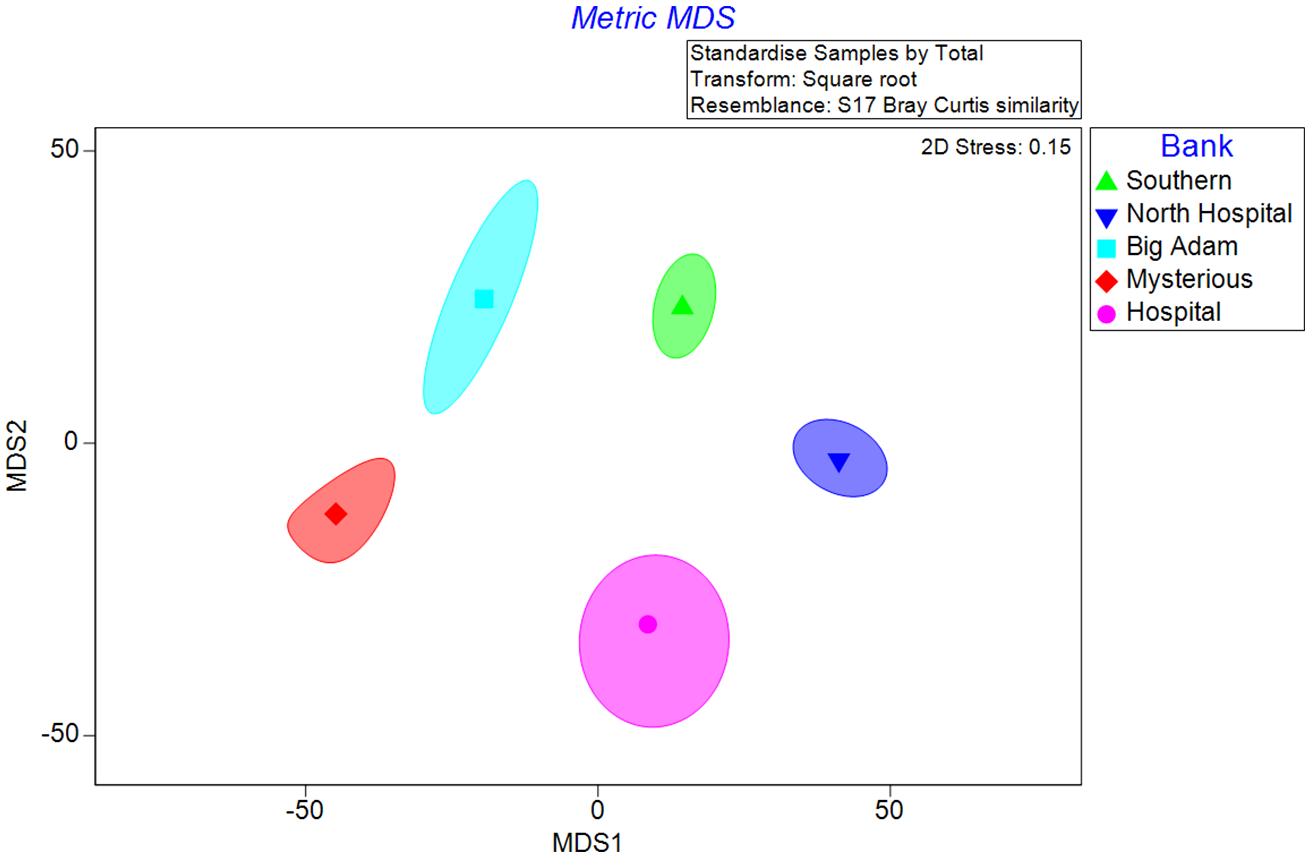 There were significant differences in both Shannon Diversity (ANOVA: F3,17 = 4.99, P = 0.014) and species evenness (ANOVA: F3,17 = 4.99, P = 0.014) among the banks (Table S4). For Shannon Diversity, Southern Bank had the highest mean value (1.51 ± 0.49 SE) followed by North Hospital Bank (1.14 ± 0.36 SE), Hospital Bank (0.58 ± 0.58 SE), Mysterious Bank (0.27 ± 0.32 SE), and Big Adam Bank (0.13 ± 0.48 SE) (Tukey’s HSD: P<0.05). Southern and North Hospital Banks had higher mean species evenness (0.67 ± 0.17 SE and 0.63 ± 0.12 SE respectively) compared to Hospital (0.58 ± 0.58 SE), Mysterious (0.27 ± 0.32 SE) and Big Adams Banks (0.13 ± 0.48 SE) (Tukey’s HSD: P<0.05).