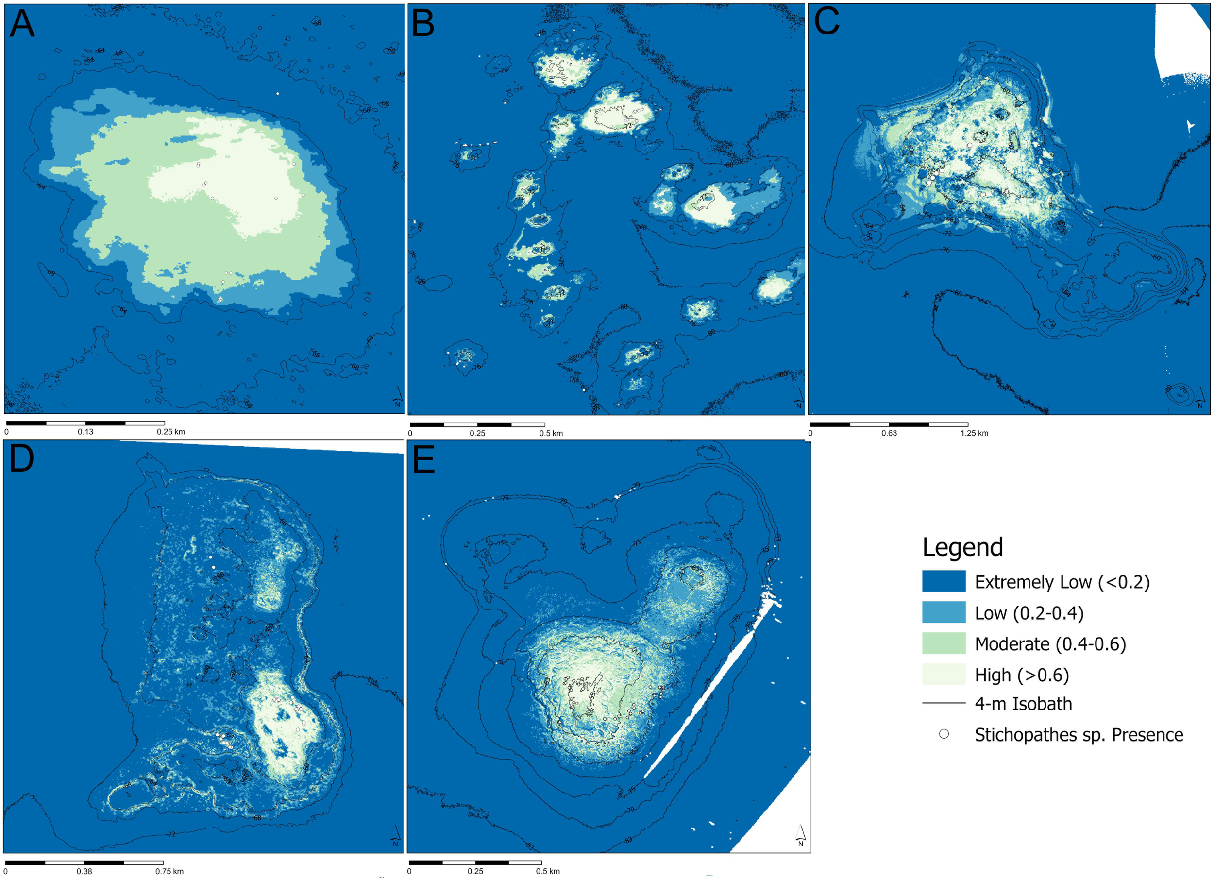 Predictive model of habitat suitability for Stichopathes spp. at (A) Big Adam Bank, (B) Mysterious Bank, (C) Hospital Bank, (D) North Hospital Bank, and (E) Southern Bank. Areas that are white to pale blue have a higher probability of the presence of Stichopathes spp., whereas areas that are darker blue have a low probability that Stichopathes spp. will be present.