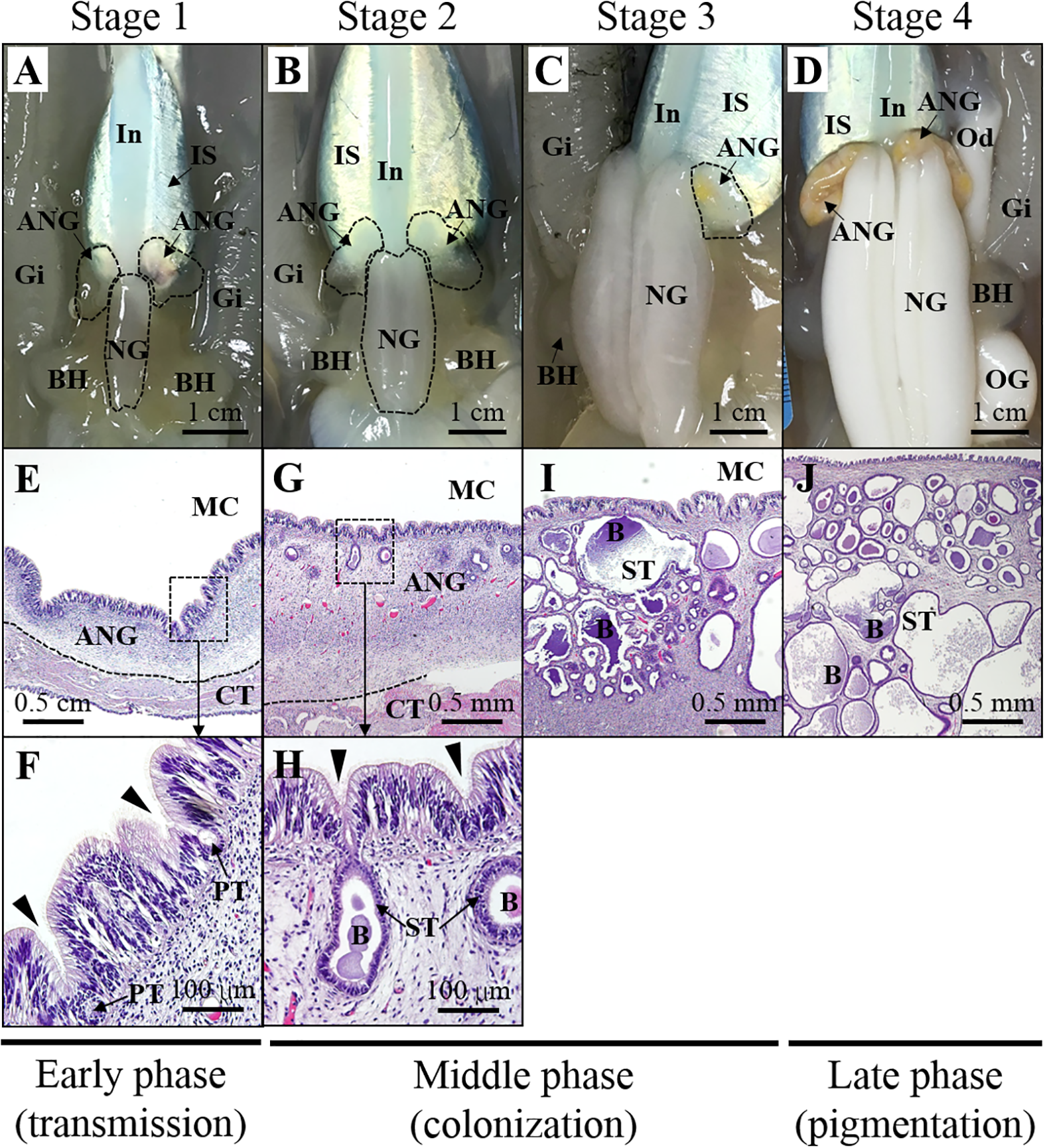 Morphological and histological changes during ANG growth. Relationship between morphology (A–D) and histology (E–J) of ANG during female maturation. Morphological changes in ANG stages are shown as follows: (A) juvenile squid with a colorless ANG (stage 1); (B) immature squid with a colorless ANG with several white spots (stage 2); (C) maturing squid with a white/yellow ANG (stage 3); (D) mature squid with a pigmentary ANG (stage 4). Histological changes in ANG stages are shown as follows:(E, F) juvenile squid without visible bacterial colony in the ANG (stage 1); (G, H) immature squid with several bacterial colonies in the ANG (stage 2); (I, J) bacterial colonies widely spread in the ANG (stage 3 and stage 4). Based on the process of ANG development, three phases are divided in this study, namely, early transmission phase, middle colonization phase, and late pigmentation phase. ANG, accessory nidamental gland; B, bacteria; BH, branchial heart; CT, connective tissue; Gi, gills; In, intestine; IS, ink sac; NG, nidamental gland; OG, oviductal gland; PT, primary tubule; ST, secondary tubule.