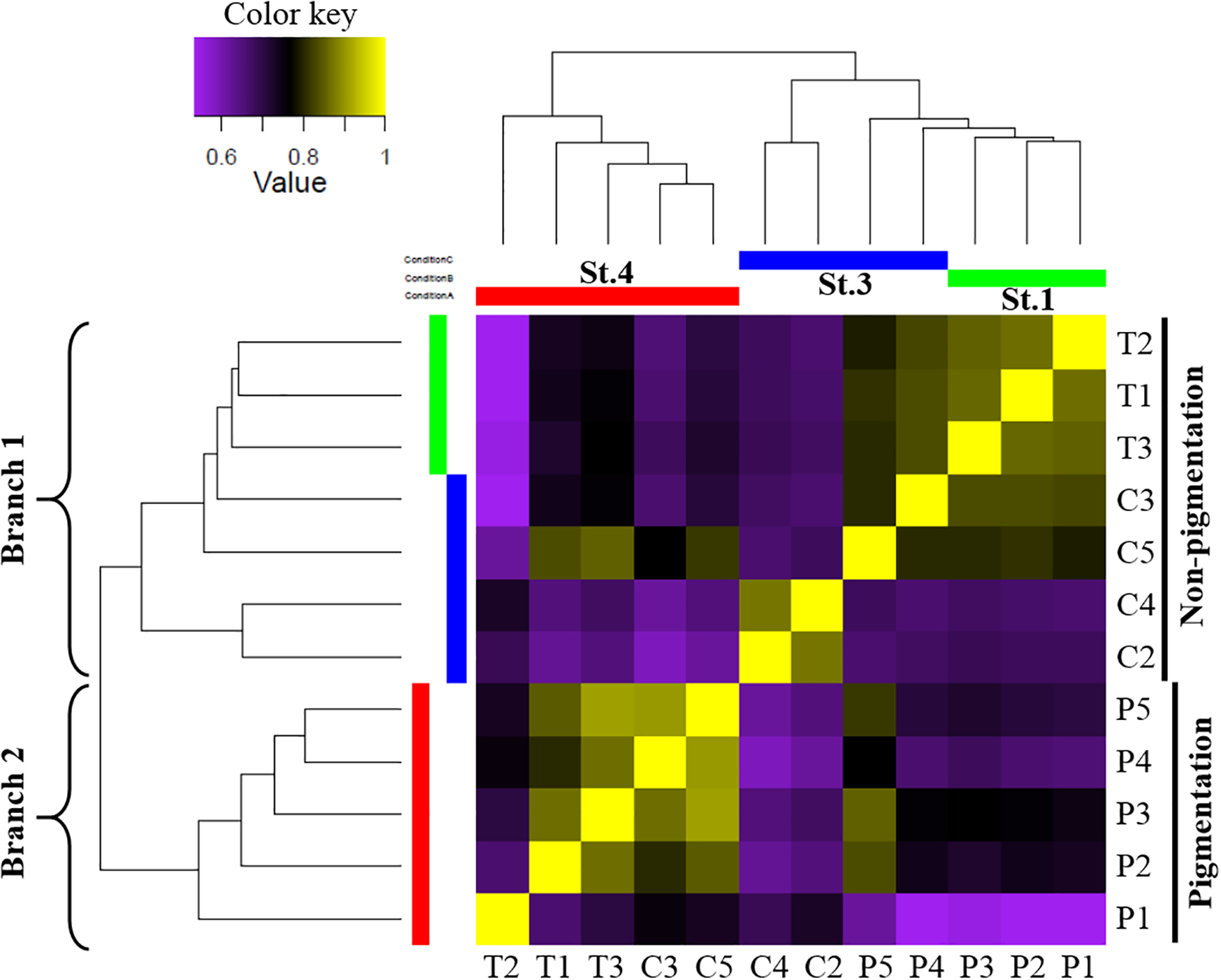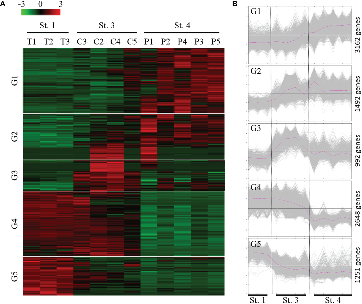 The clean reads for each sample were mapped to the reference transcripts using the Salmon in the Galaxy platform. The TPM (transcripts per million) values were used to represent the expression level of each sample’s transcripts. Statistically significant differentially expressed genes (DEGs) between the different groups were identified using DESeq2 software, and the filter parameters were | log2 Fold Change| > 1 and adjusted p value < 0.001. These DEGs were clustered using hierarchical clustering of Pearson correlation with the Trimmed Means of M values (TMM). TransDecoder was used to identify putative open reading frames (ORFs) from the DEGs. For functional annotation, predicted peptides of DEGs were annotated using the public database eggNOG v5.0 with eggNOG-mapper v2 (Cantalapiedra et al., 2021). This tool can be used to find clusters of orthologous groups in the eggNOG database and annotate them using Gene Ontology (GO) and the Kyoto Encyclopedia of Genes and Genomes (KEGG). The functional properties of genes and gene products in organisms can be annotated by GO. KEGG pathway analysis was performed to identify pathways for intracellular molecular interactions and their organism-specific variations, not including human disease pathways.