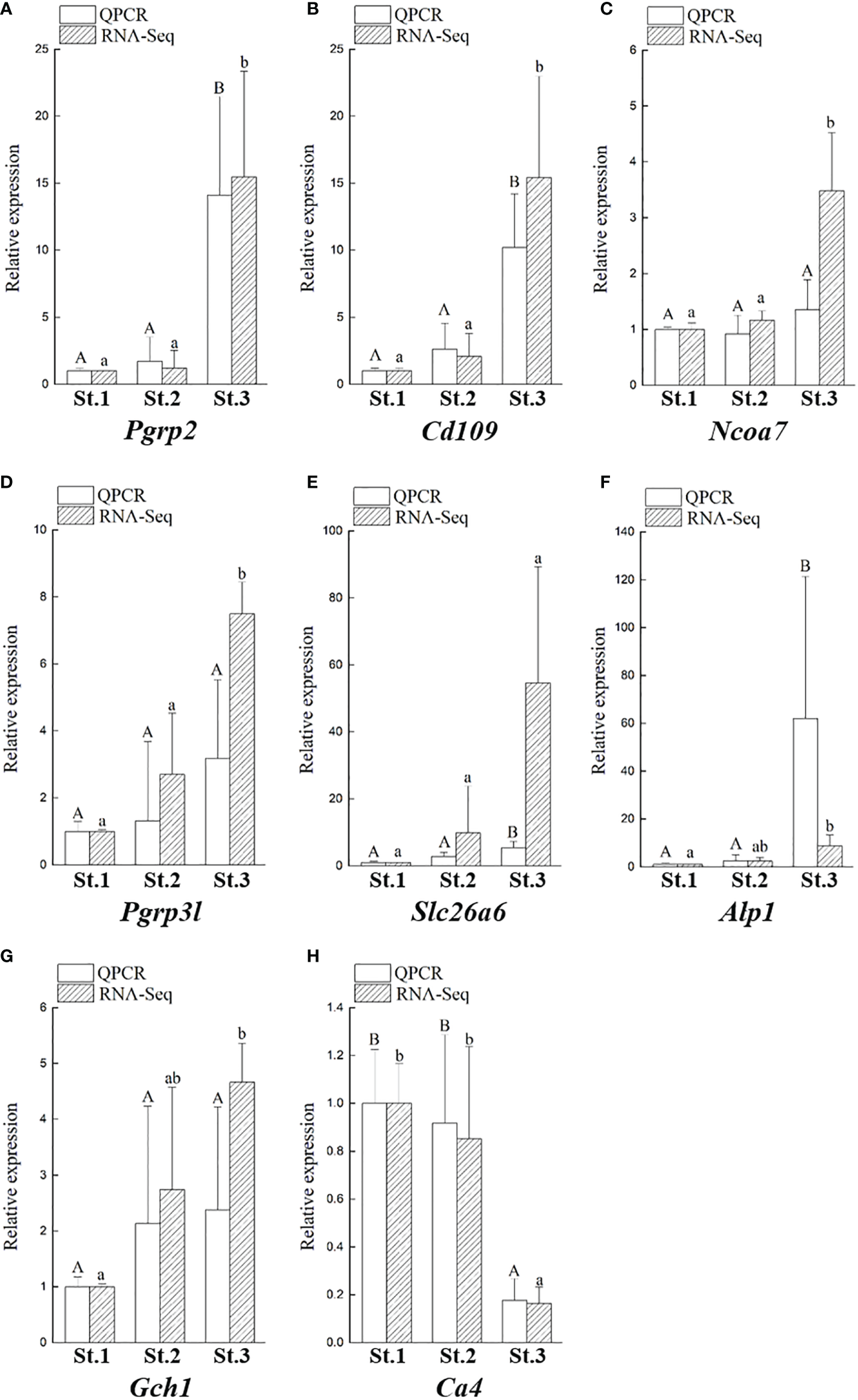Quantitative real-time PCR (qPCR) was carried out using CFX Connect™ Real-Time PCR Detection System (Bio-Rad Laboratories) with SYBR Green Master Mix (Bio-Rad Laboratories). Elongation factor 1 alpha (Ef1a; GenBank accession no. MG924746) was used as an internal standard to normalize the gene expression levels. Specific qPCR primers for target genes are listed in Table 2. The qPCR specificity was confirmed by a single melting curve in samples and template-containing controls. No signal was detected by qPCR in non-template controls. The reaction efficiency of different genes was evaluated using serially diluted standards. The relative gene expression levels were determined according to the 2-ΔΔCt method, and the highest value of the target genes was defined as 1. Using the same ANGs used for qPCR analysis in our recent studies (Li et al., 2022), the transcript levels of Pgrp2 were analyzed by qPCR in our recent studies (Li et al., 2022).