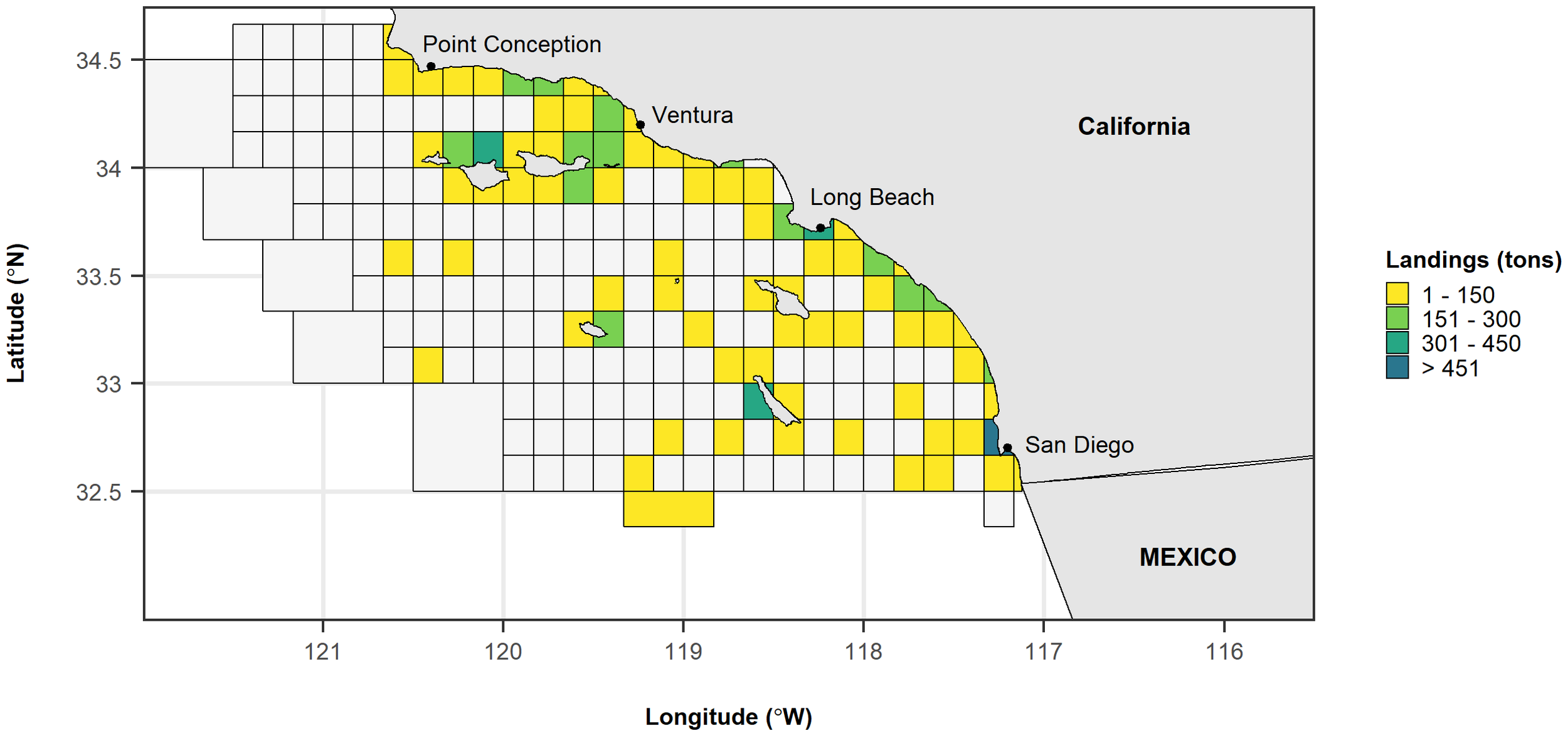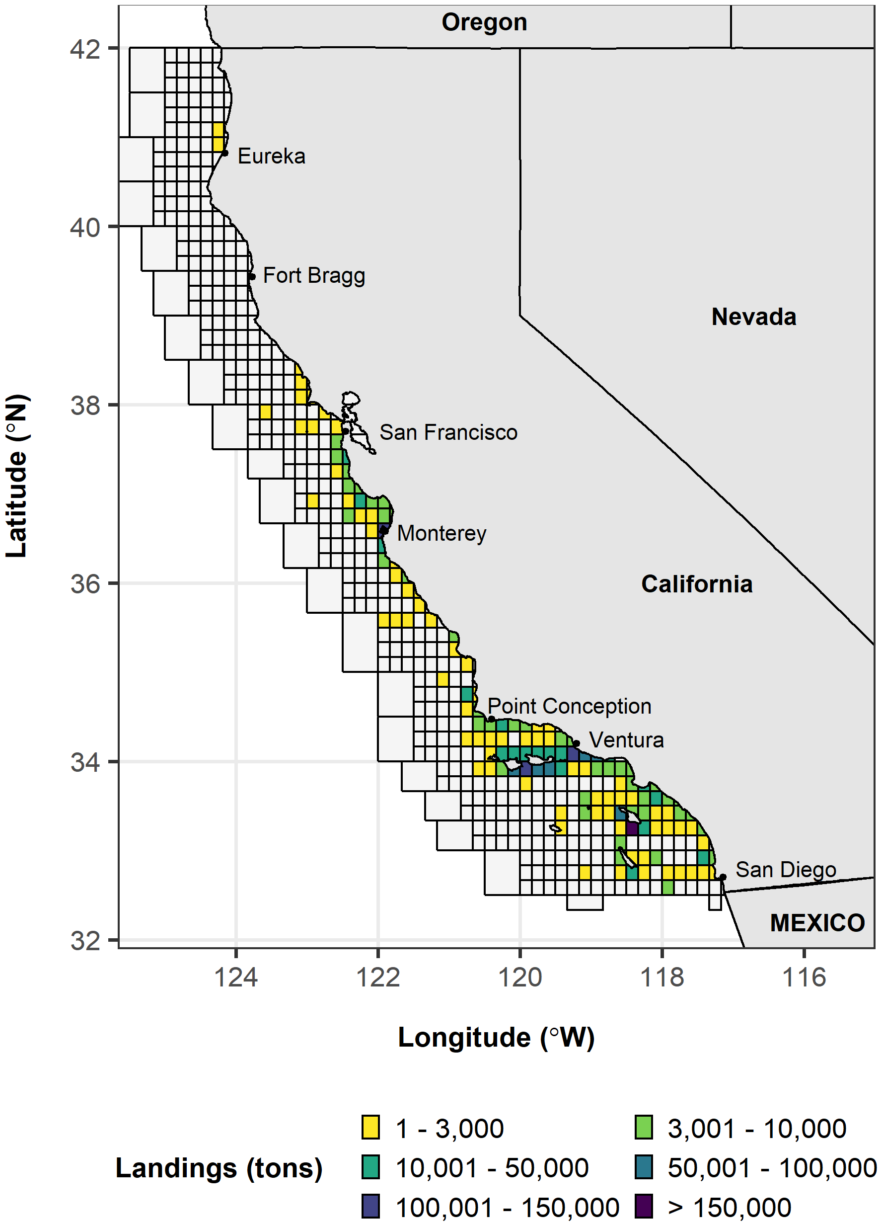 Map of total California commercial market squid fishery landings (tons) by fishing block from 1996 to 2018 fishing seasons (CDFW MLDS). Fishing blocks with less than 15 entries were excluded.