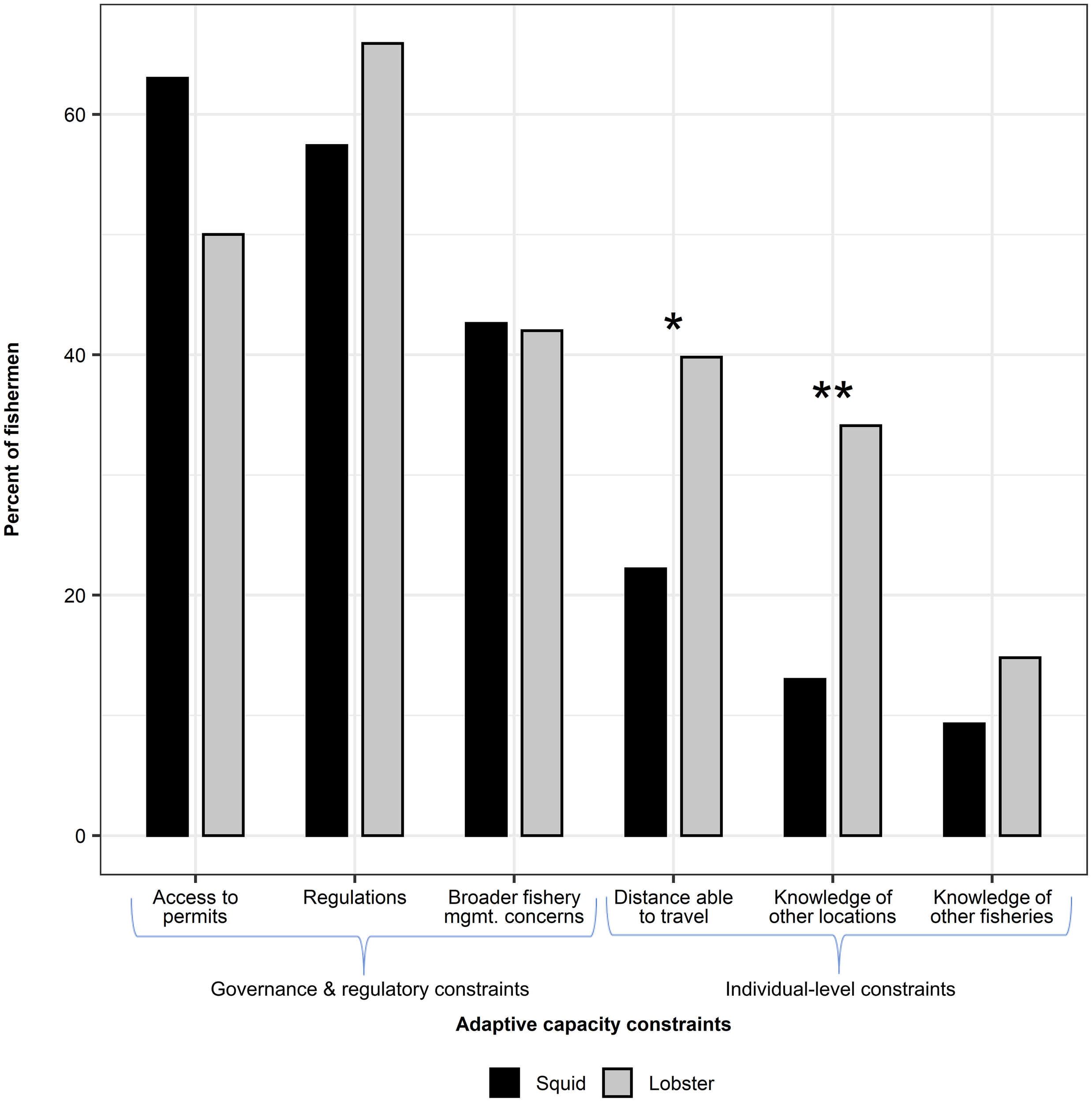 Percent of market squid fishermen (n = 54) and spiny lobster fishermen (n = 88) who stated that each factor constrained their capacity to adapt to future change. * Statistically significant difference between the proportion of fishermen in each fishery (z = 2.16, p = 0.015). ** Statistically significant difference between the proportion of fishermen in each fishery (z = 2.78, p = 0.003).